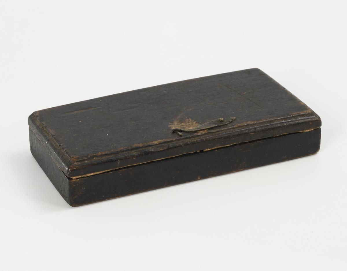 Ebonized hardwood (walnut?), iron scales, brass weighing pans and weights. 2.5 x 15 x 7.5 cm.