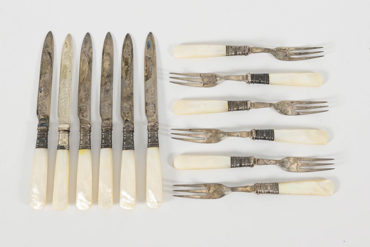 12-piece silver cutlery set: 6 forks and 6 knives with mother-of-pearl handles. In brown box. Slight signs of age and wear.