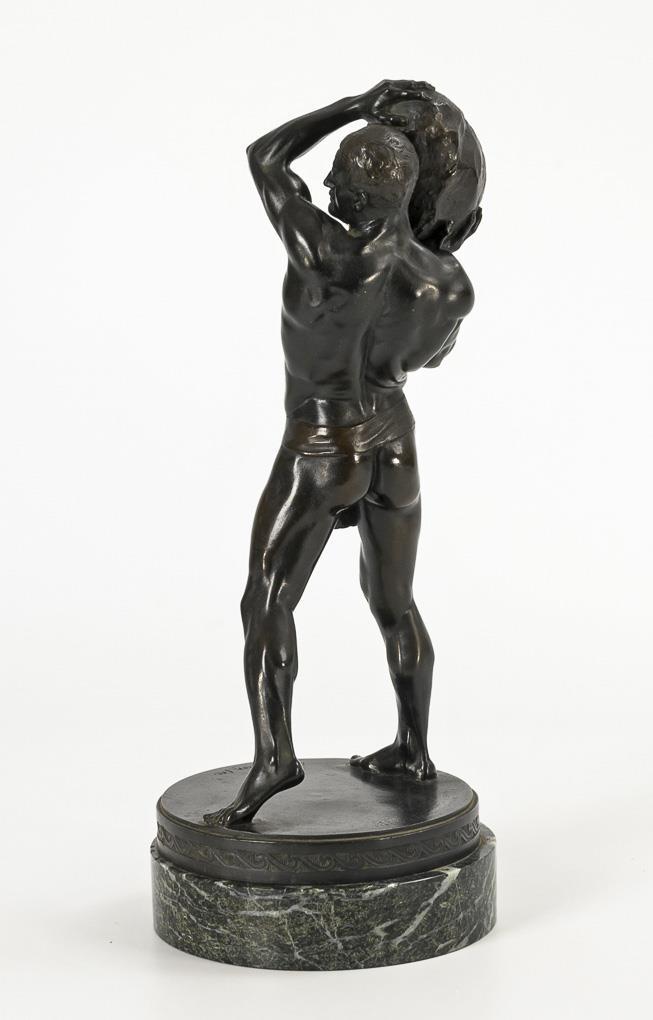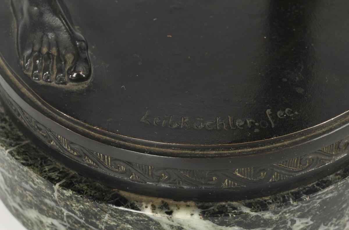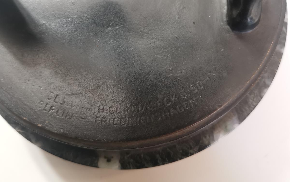 Bronze with black patina, green marble plinth. Inscribed, indistinct foundry mark "Akt.-Ges. vorm. H. Gladenbeck u. Sohn Berlin-Friedrichshagen". H 33 / 36 cm.