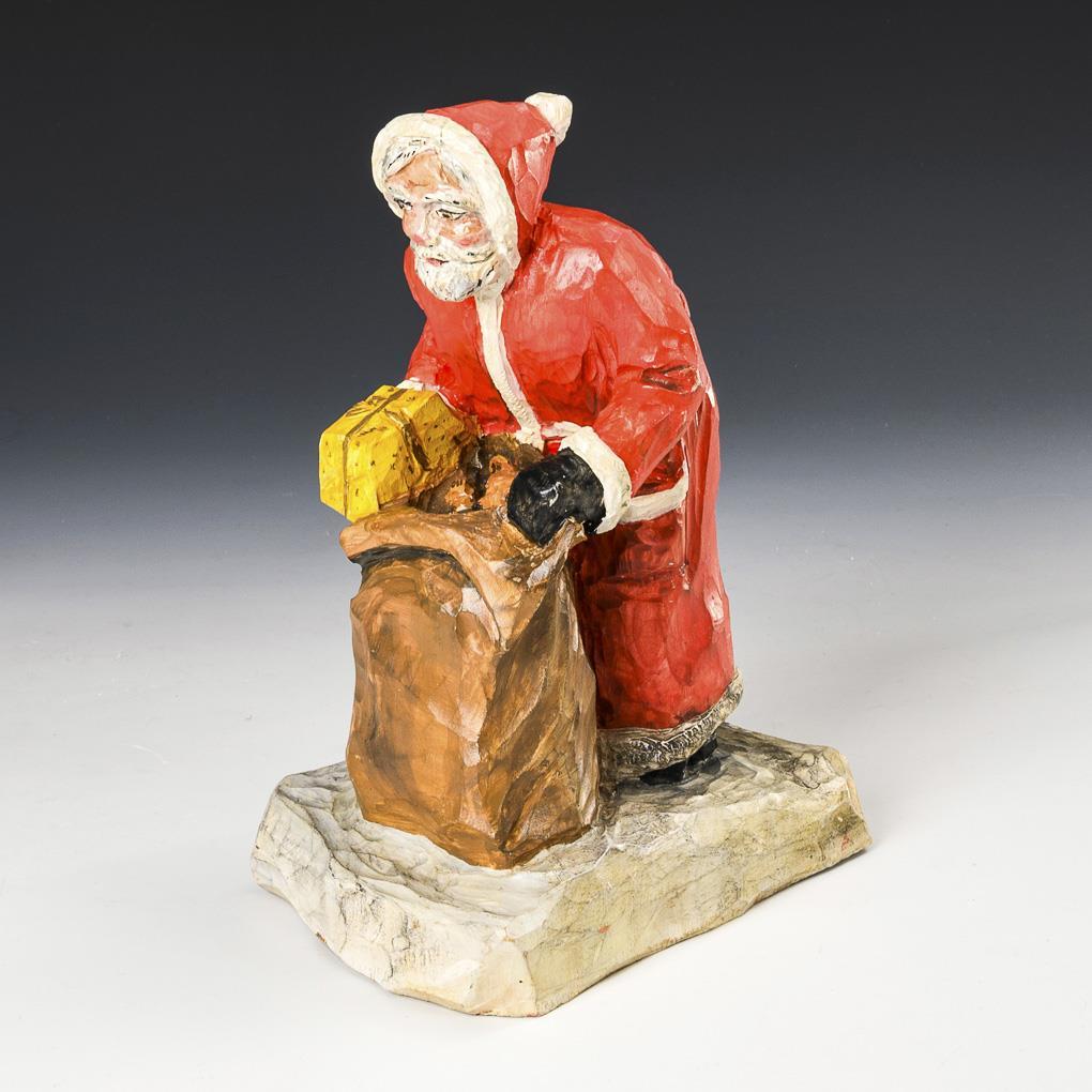 Carved and painted Santa Claus made of wood in a bent posture over an open sack of presents / Movable Santa Claus made of wood hanging tin Christmas tree decorations on a Christmas tree. Working principle of a hurdy-gurdy. H 32.5 cm. / Group of trees with three fir trees made of wood, plastic and artificial snow. Slight signs of use.