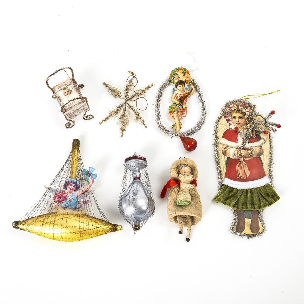 3x tree ornaments with leonic wires and collector´s picture (grid print): Zeppelin, bed and tethered balloon. Plus absorbent cotton child, tinsel star and 2 cardboard pendants.