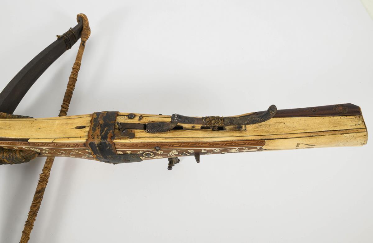 Column extensively inlaid with bone, floral bone inlays and block band inlays on the sides. Engraved number "37" on the shaft. An engraved double fleur-de-lis on the front of the butt (butt cap). Fitted with sights and locking wing. In addition a replaced bolt. Dry cracks and defects on the bone plates. Metal plates screwed onto the nut area to stabilize a crack. Mechanics present. Bolt holder broken off.