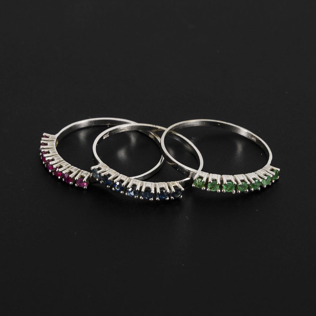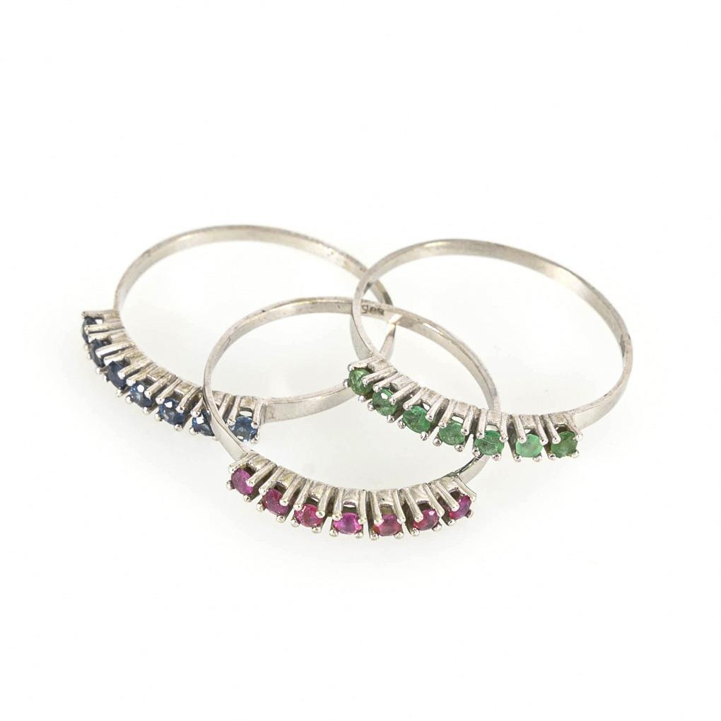3 stud rings with emeralds, rubies and sapphires.