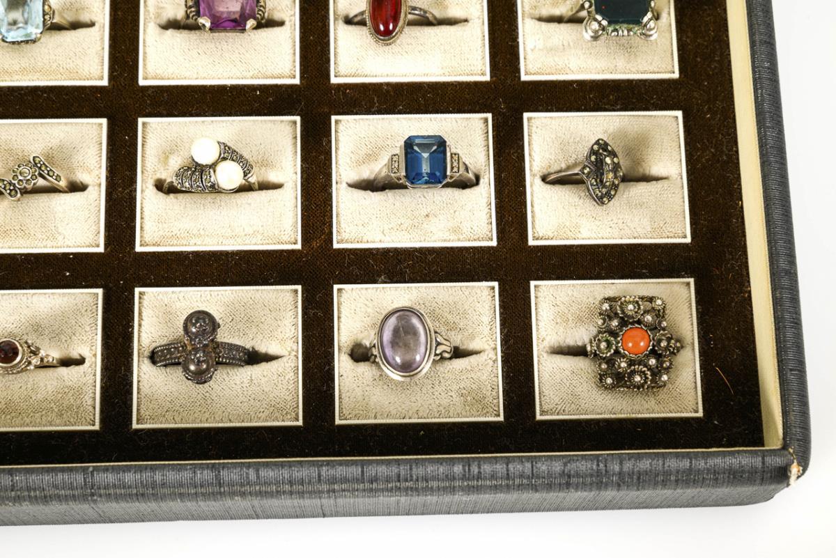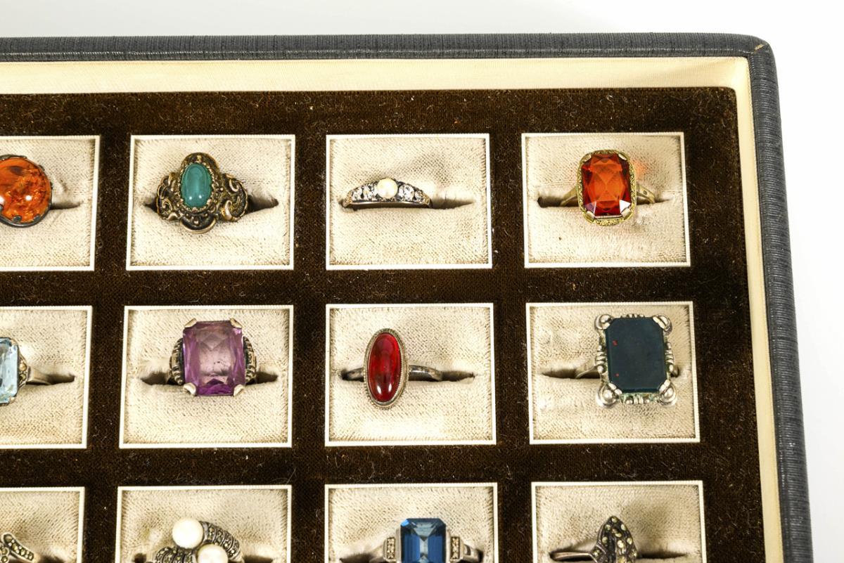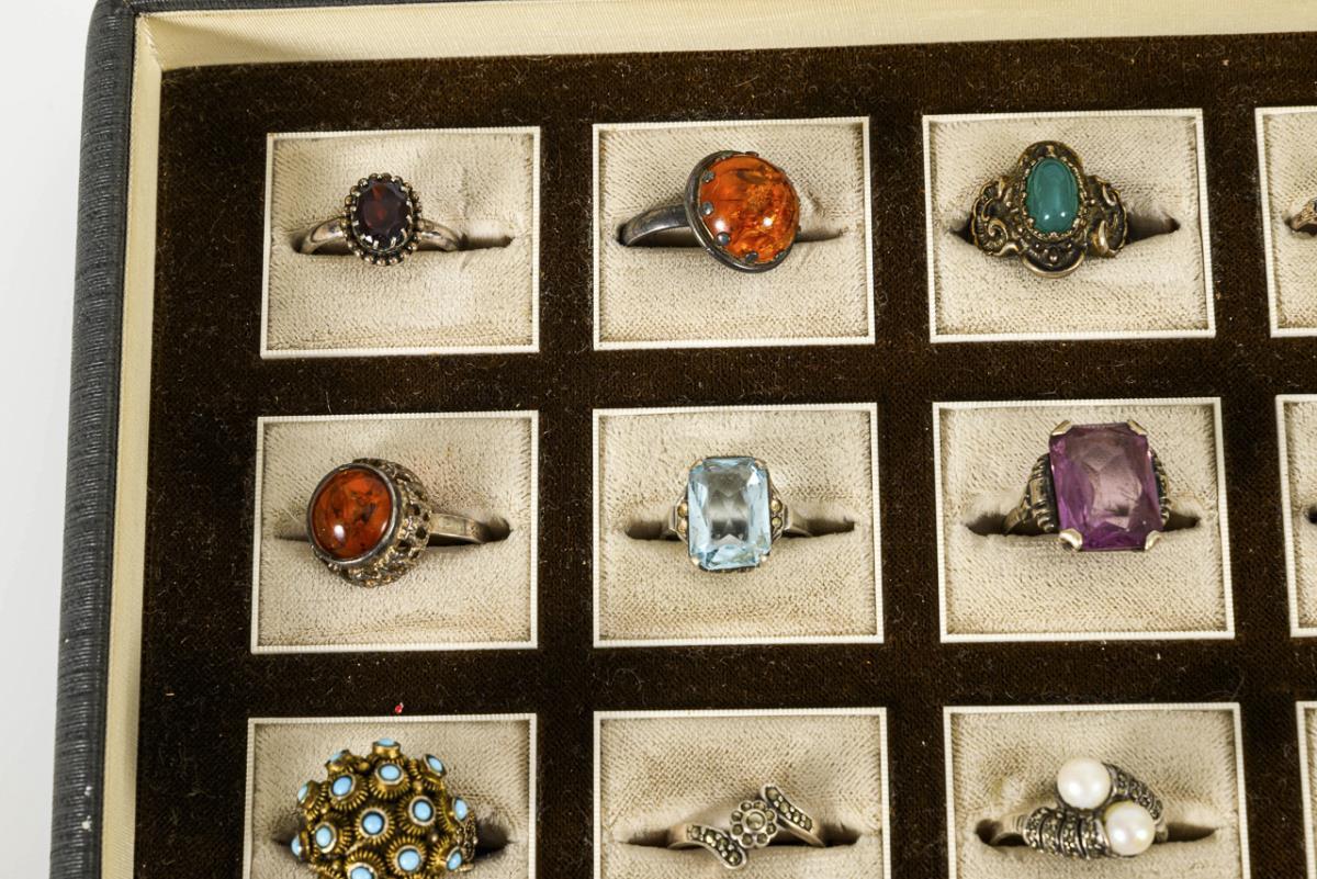 20 rings with various stones and imitations (including amber, green agate, marcasites, coral, amethyst, heliotrope). Narrow to medium rails. 3 small marcasites missing.