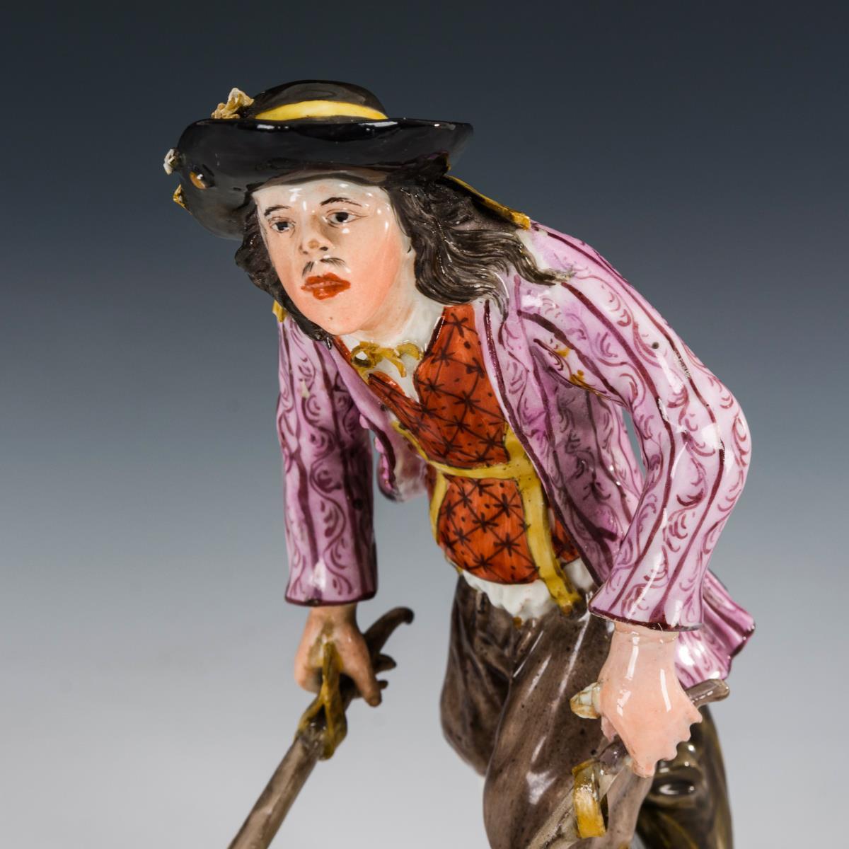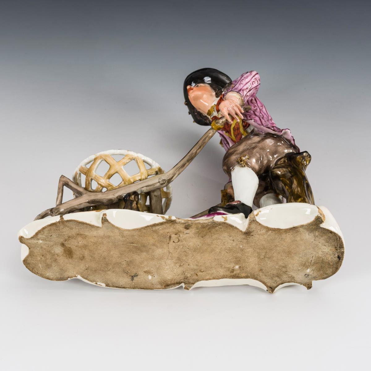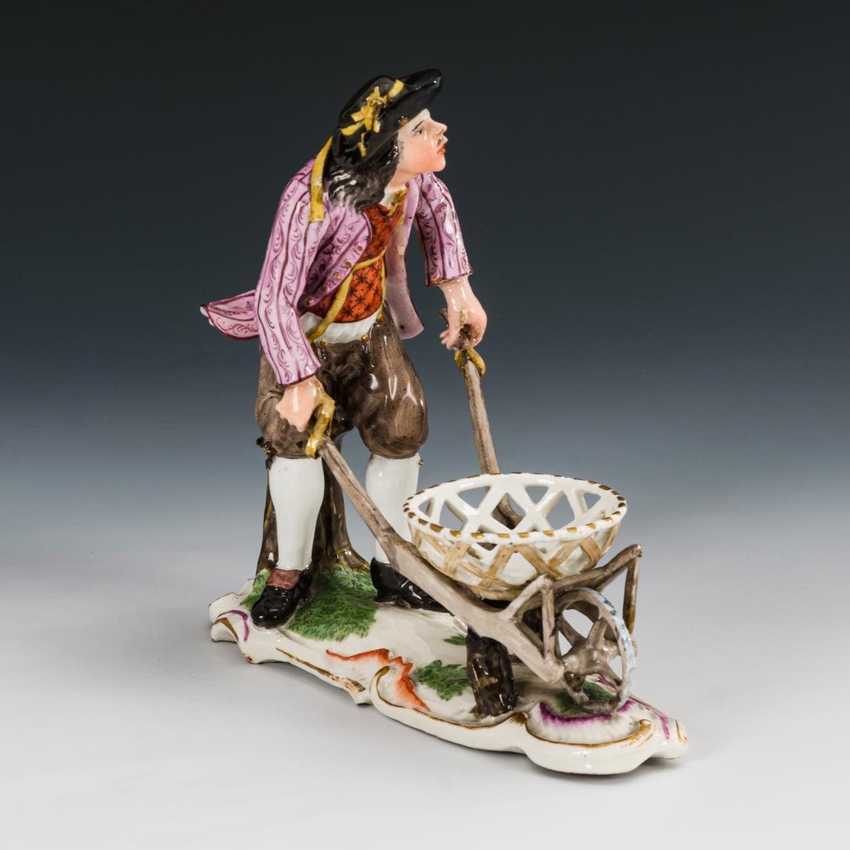 Einen Korb auf einer Schubkarre transportierender Mann, Rocaillesockel. Bänder und Sockelrand bestoßen, Hut, linke Hand und rechter Jackensaum restauriert, Gold etwas berieben.