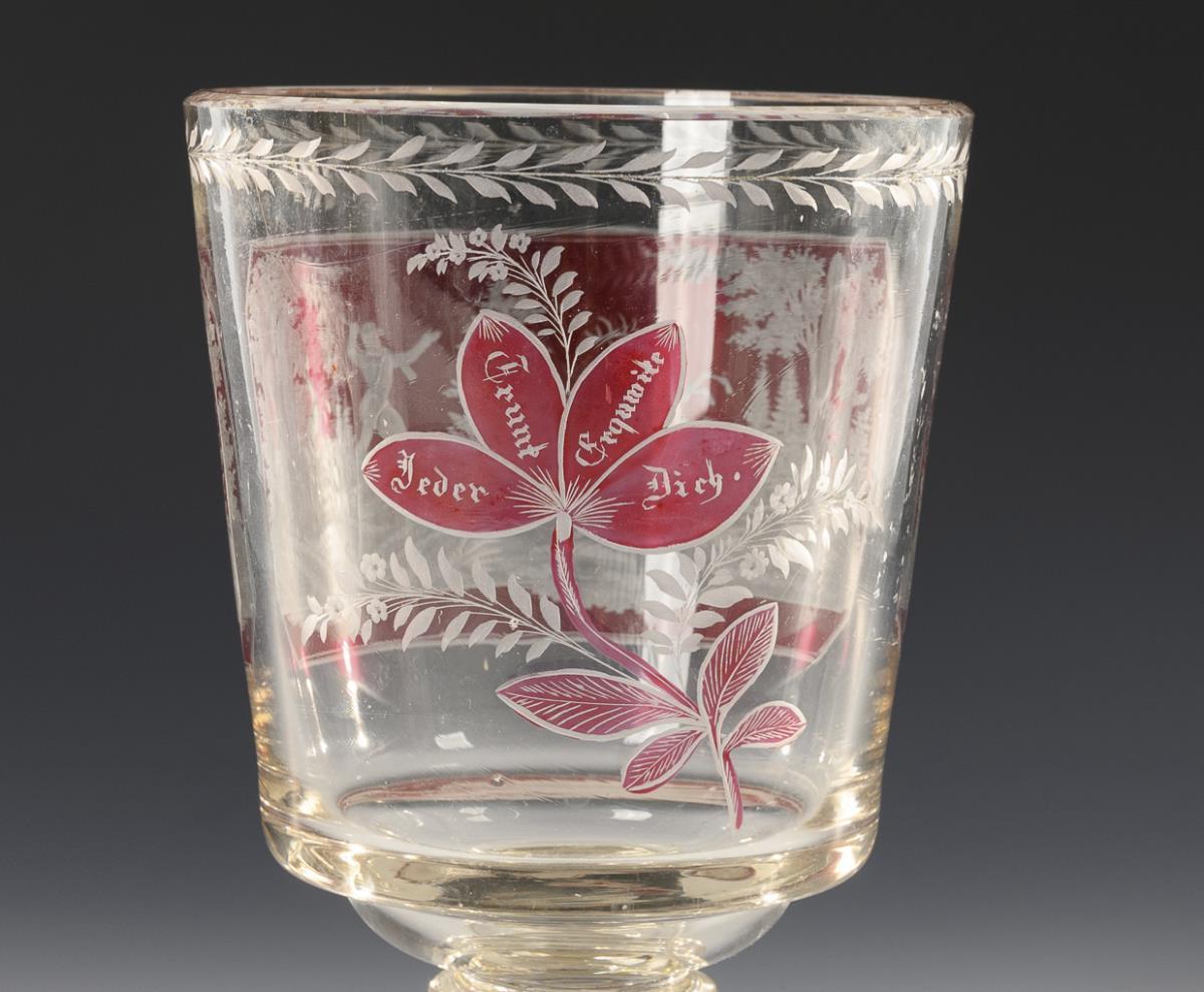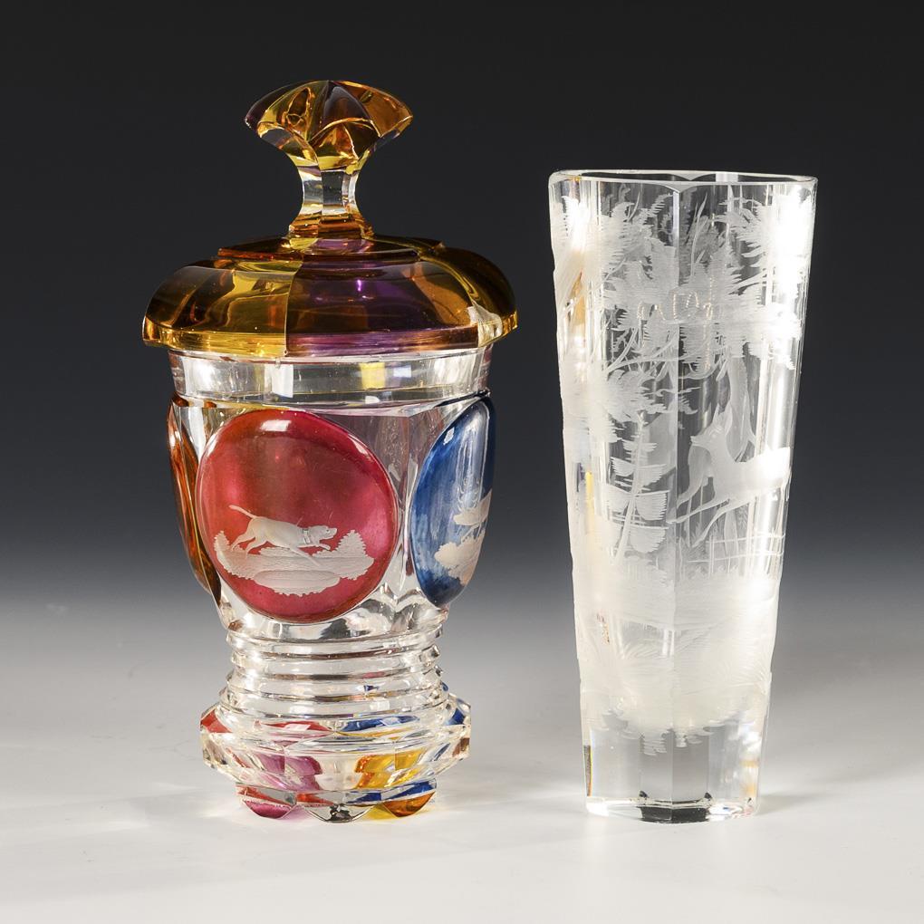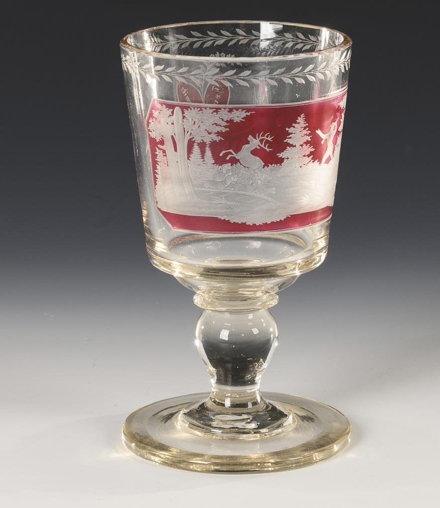 1x hunting goblet made of colorless, partly pink-stained glass: conical bowl, solid baluster stem and round base, the front depicting a forest landscape with hunter, dogs and stag, verso the saying "Jeder Trunk Erquwike Dich" (H 21 cm). / 1x faceted lidded goblet of colorless, polychrome stained glass with original (?) knobbed lid, in high-cut medallions the depiction of a stag, a horse and a dog (H 17 cm). / 1x conical, faceted beaker with a deeply carved depiction of a forest landscape with stag and deer (h 15 cm). Mouth rim and base of the beaker minimally chipped.