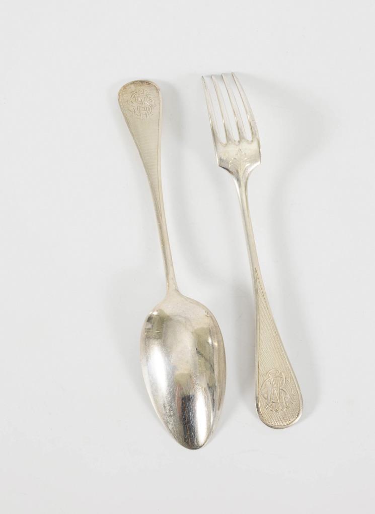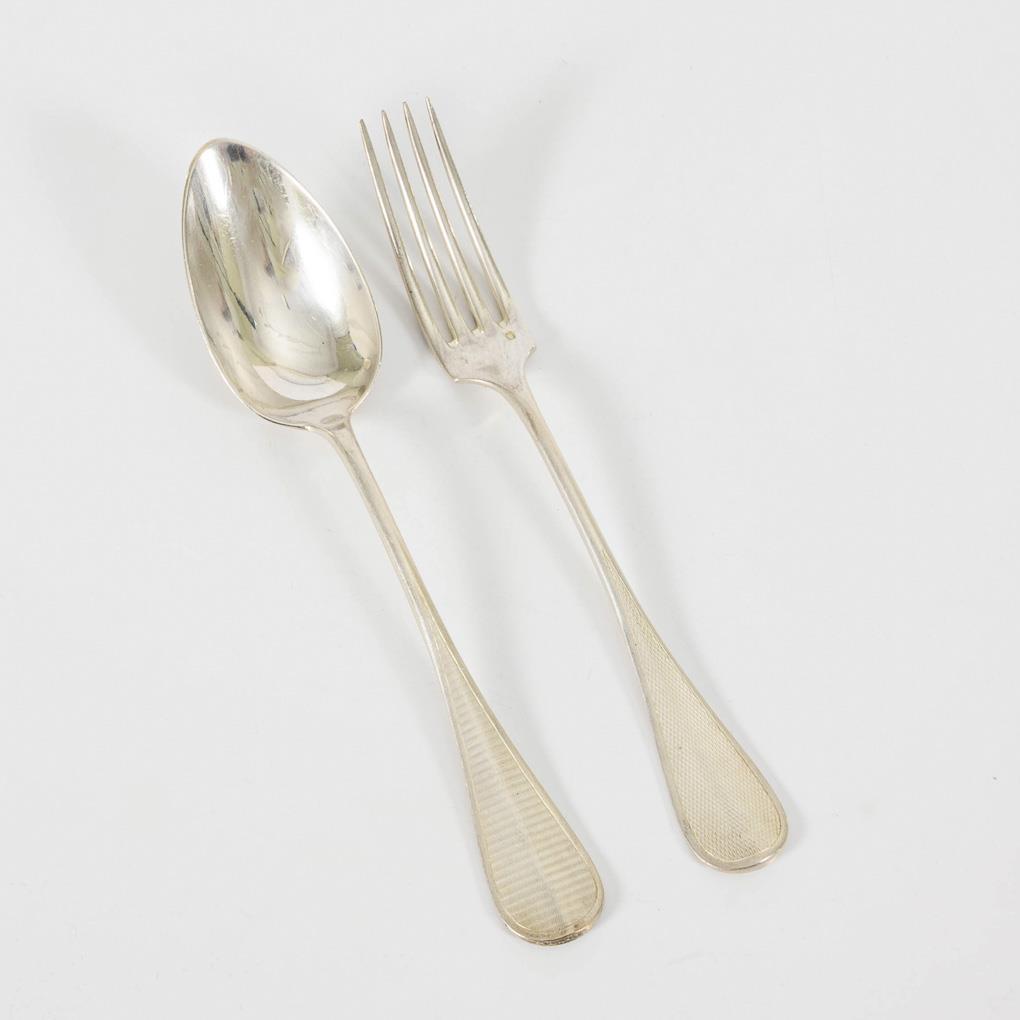 40 pieces: 8 dinner forks + 8 soup spoons with striped guilloche decoration and engraved monogram "SME" on the reverse. L each approx. 21 cm. / 12 dinner forks + 12 soup spoons with fine guilloché engraving and "RMC" monogram on the reverse. L each approx. 21.5 cm. Hardly any signs of use.