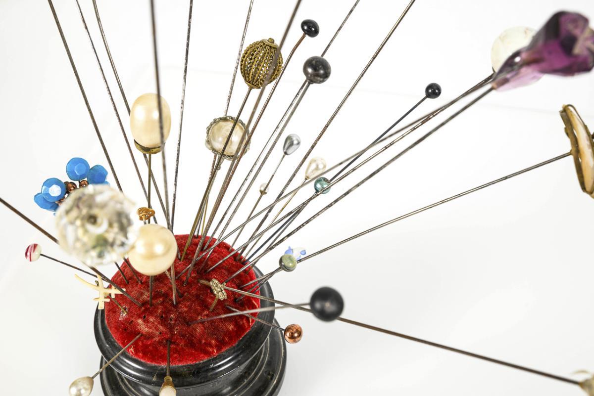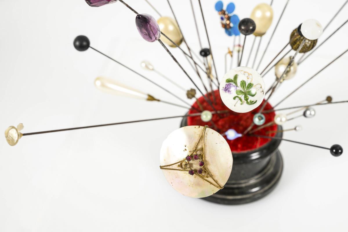 36 different pins with pin heads made of metal, glass, wood, artificial pearls, among others. Including hairpin and 3 tie/reverse pins on metal pins. Pincushion on serpentine base.