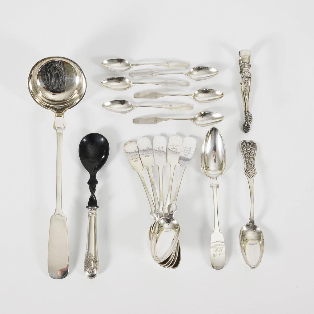 Various pieces of cutlery in Biedermeier style: 6 soup spoons with dedication engraving from 1865, 6 coffee spoons with monogram "FH", salad spoon with monogram "M", single spoon with rose relief, large soup ladle, sugar tongs. Signs of use, coffee spoon with dents, sugar tongs with old repairs.