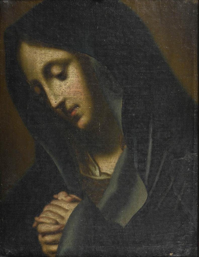 Copy after Carlo Dolci with Mary in a blue cloak looking pensively to the ground. Traces of age, one defect.