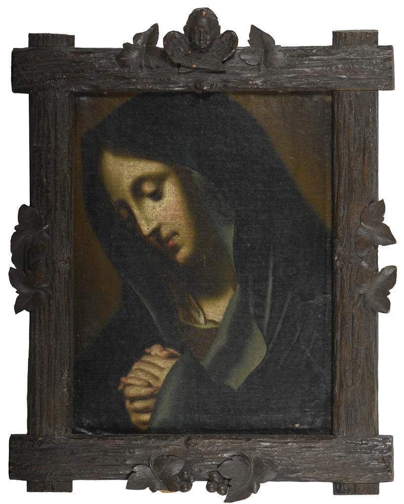 Copy after Carlo Dolci with Mary in a blue cloak looking pensively to the ground. Traces of age, one defect.