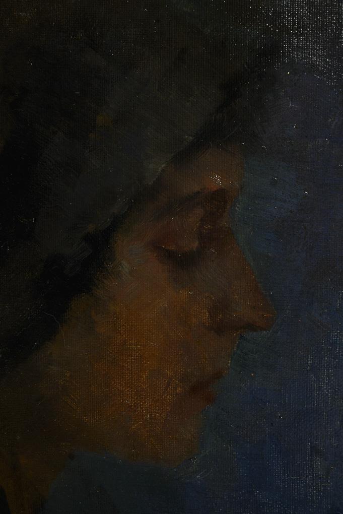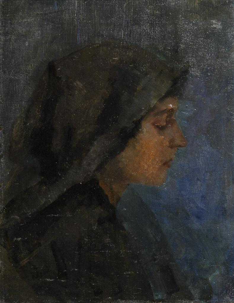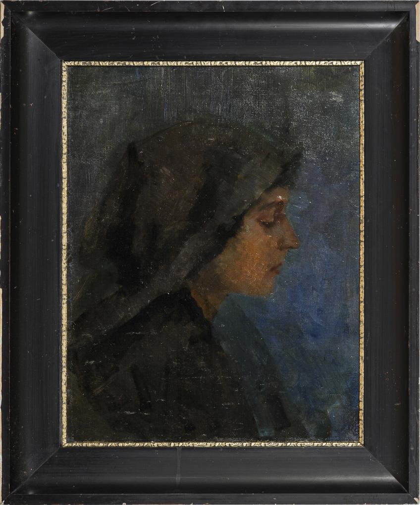 Portrait of a young woman with headscarf against a blue background. Partially retouched.