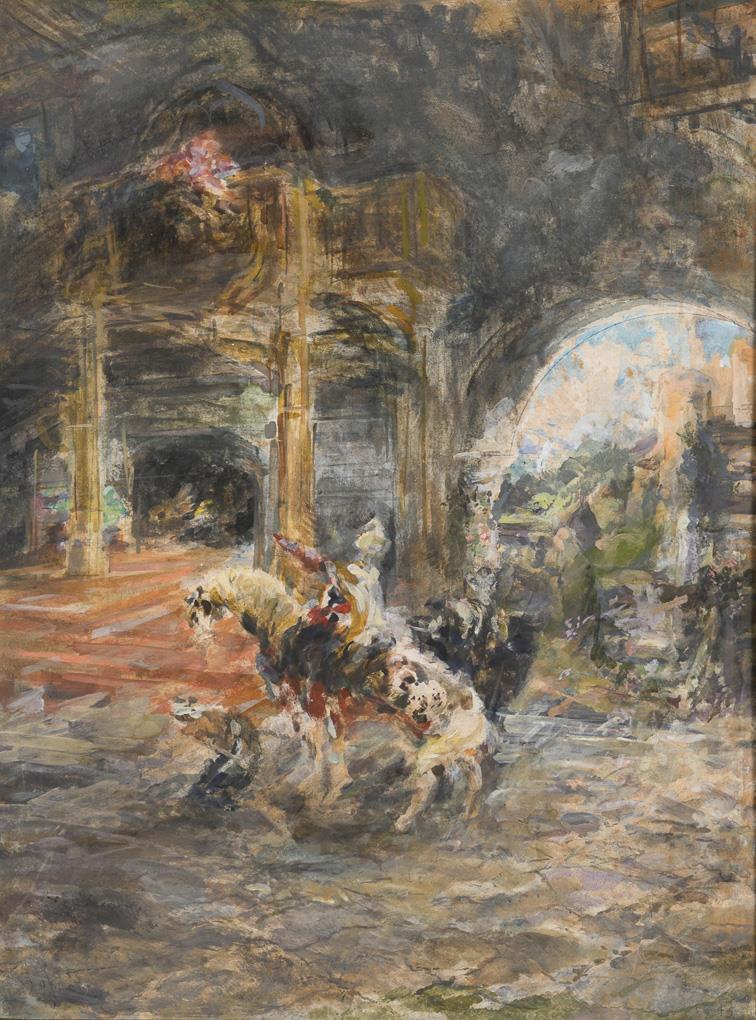 Rider on a white horse within magnificent rooms with a kneeling servant.