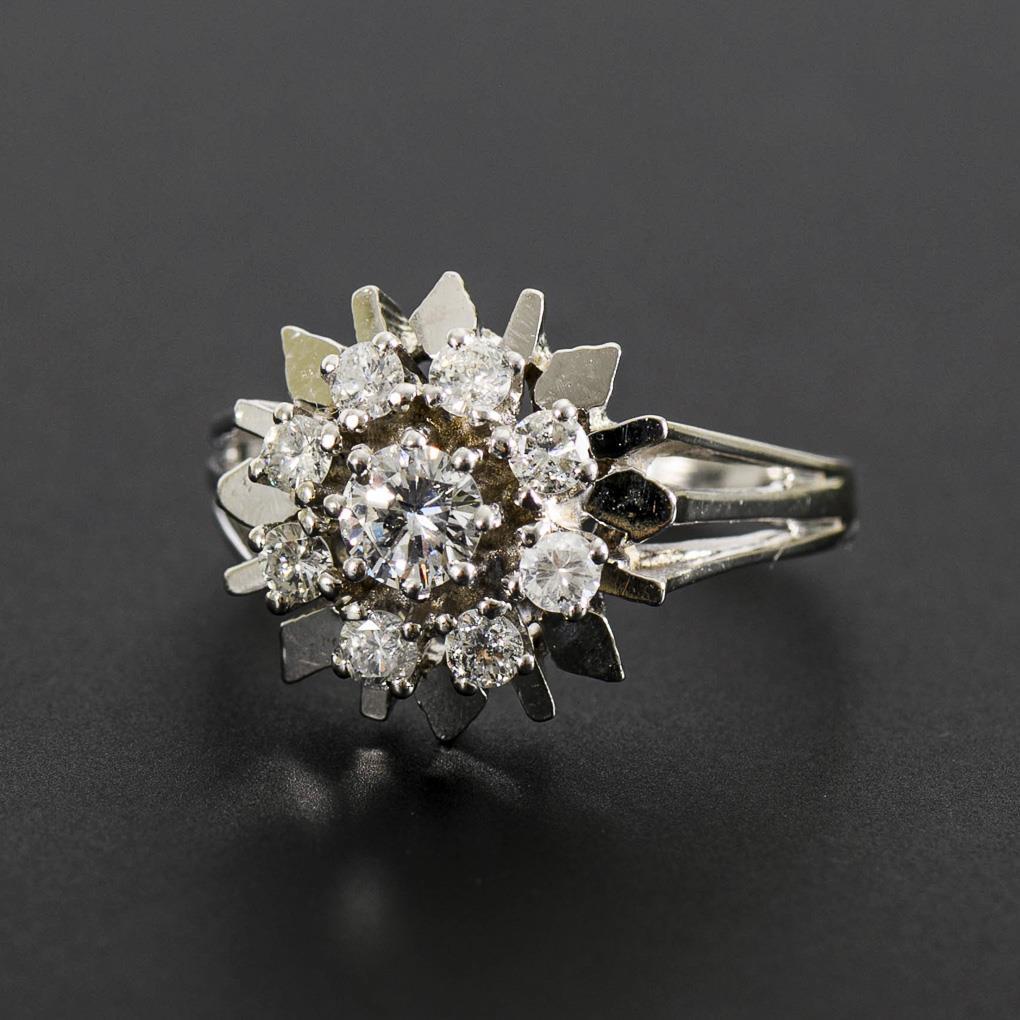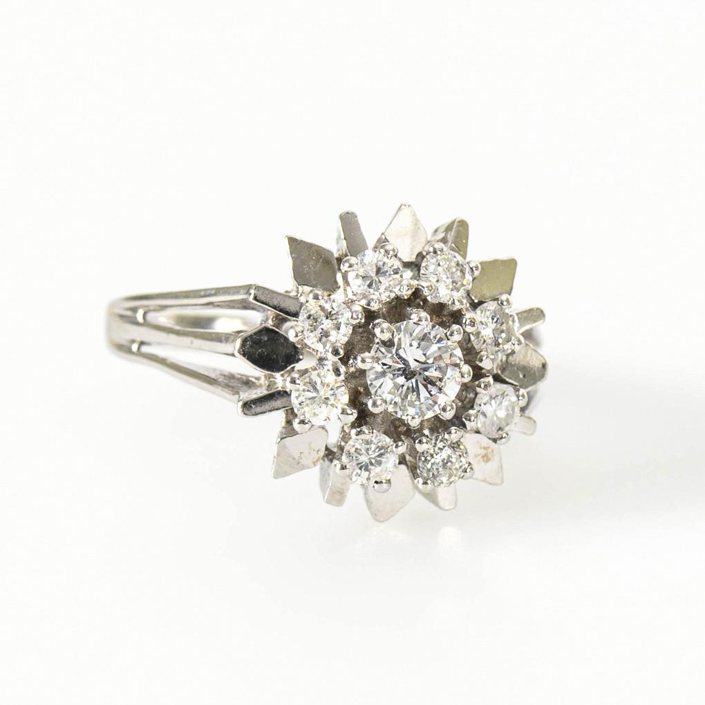 Stamped white gold 585. Brilliant center Ø approx. 4.5 mm. White/PI. Ring size 63. 6.5 g.