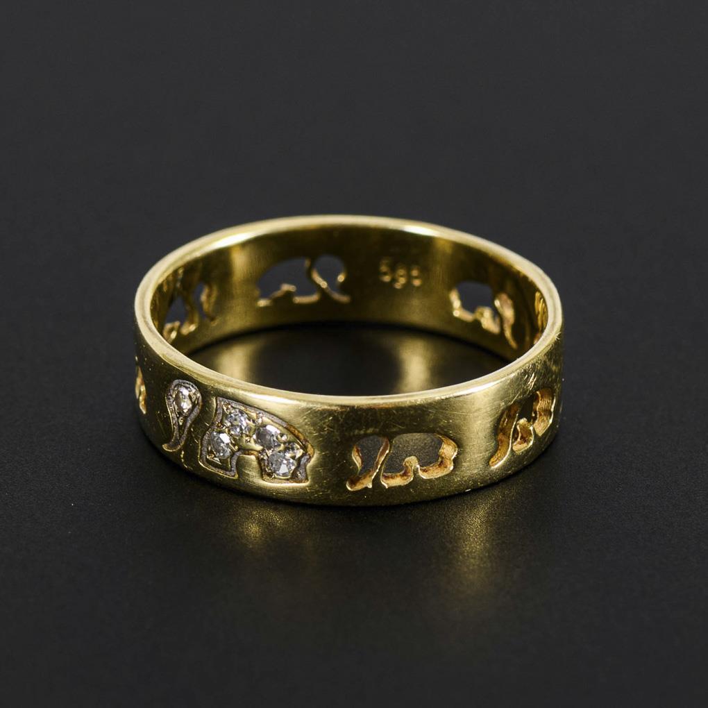 Middle hoop with circumferential elephant openings. In the center 5 small, embedded diamonds.