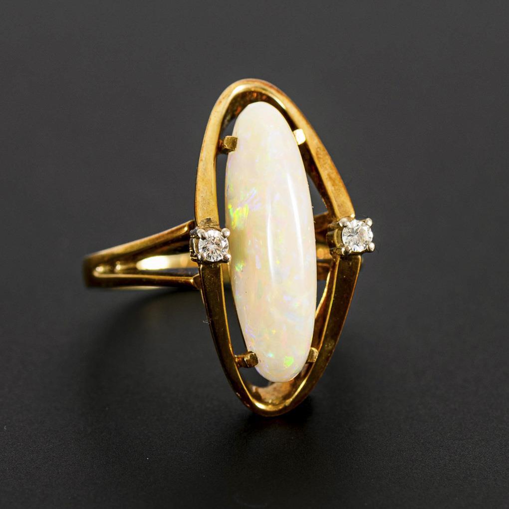 Claw-set cabochon between 2 small brilliant-cut diamonds. Narrow rail. Ring head base partially tarnished.