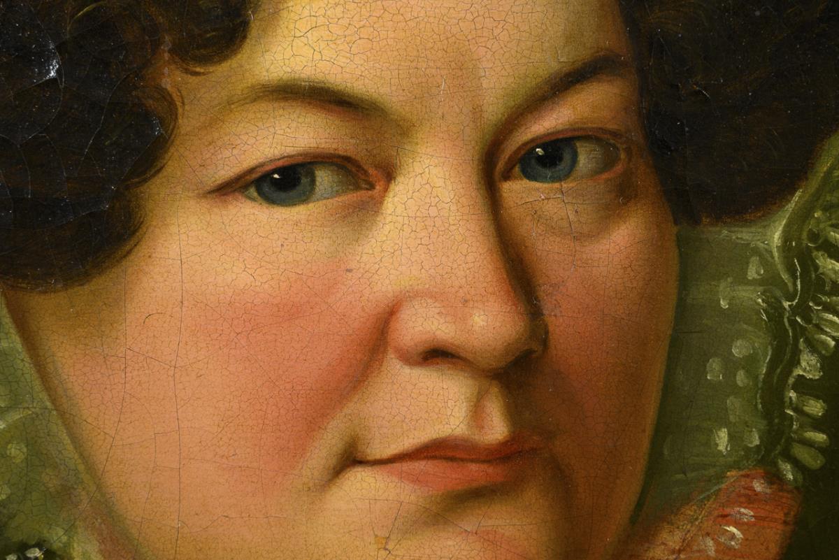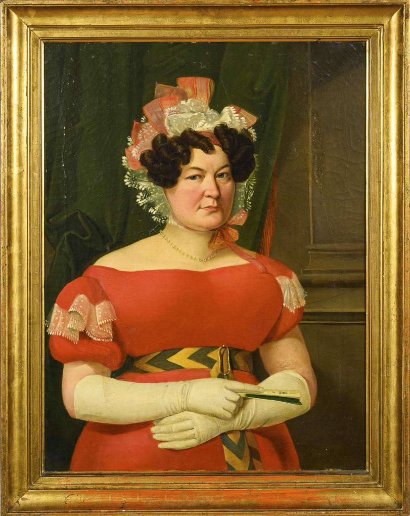 Portrait of a young woman in a red dress with a pearl necklace and a lace hood over her curly hair. A restored area.