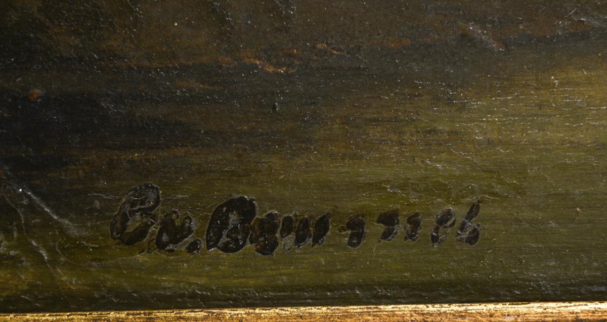 50 x 60.5 cm. Framed : 70 x 79 cm (gold stucco frame).