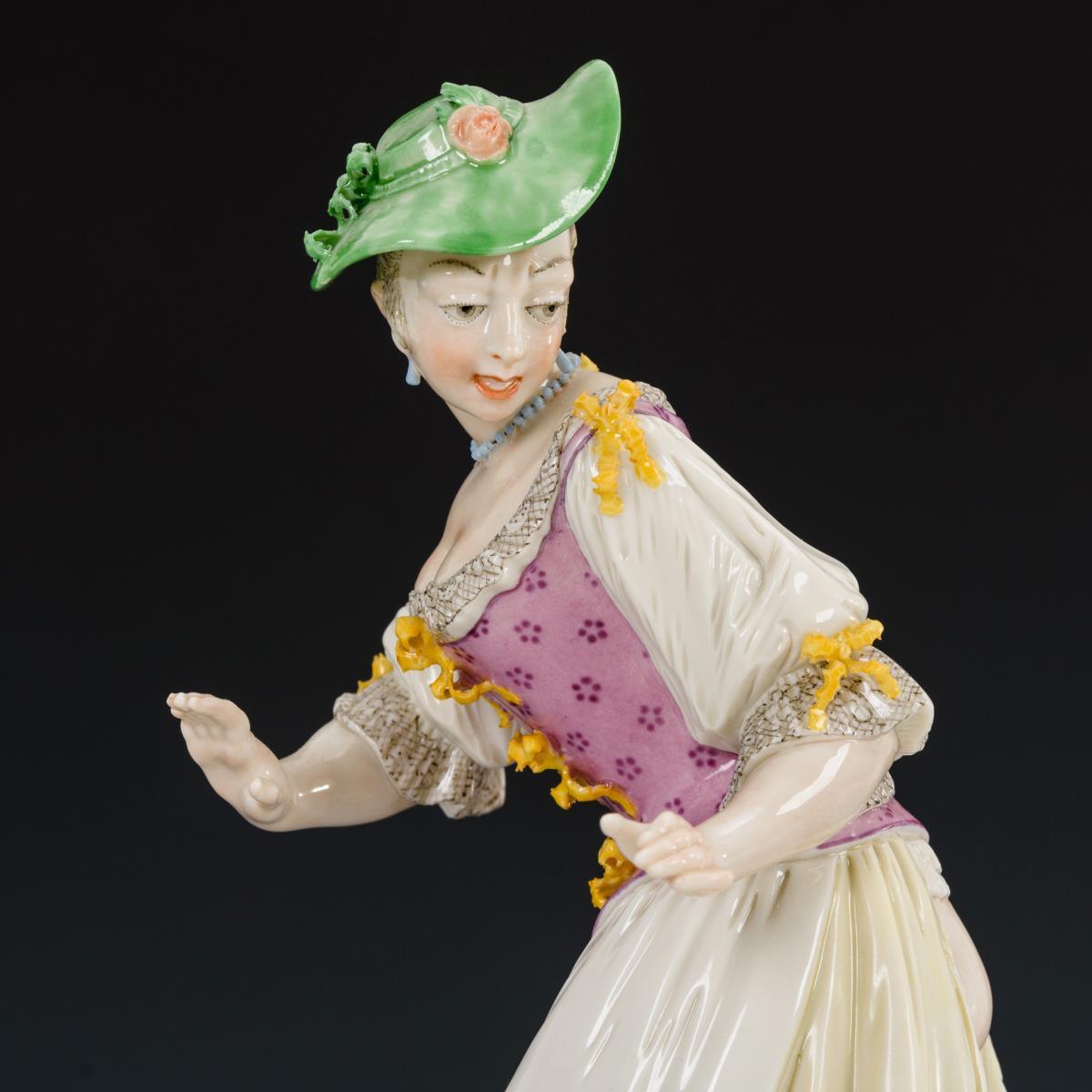 Auf einem Rocaillesockel stehende Dame, sich nach einem ihr Kleid zerreißenden Hund umschauend.