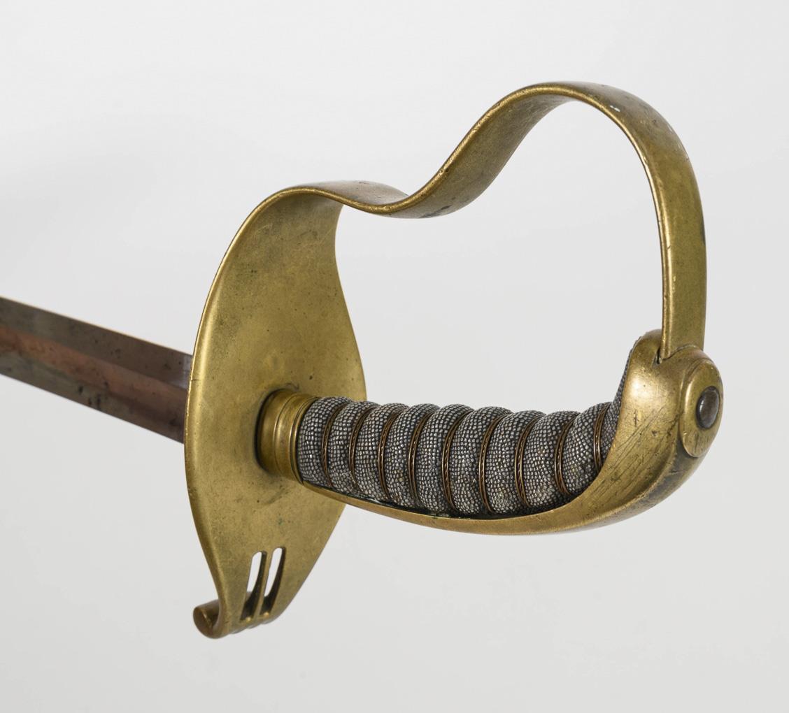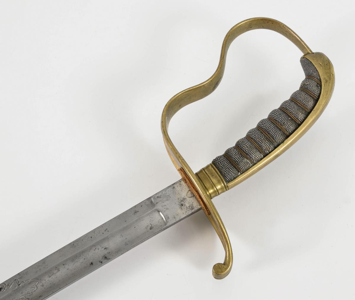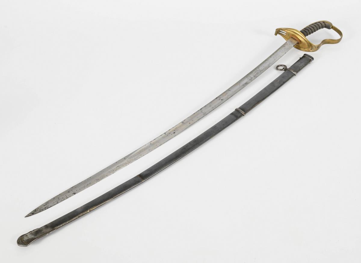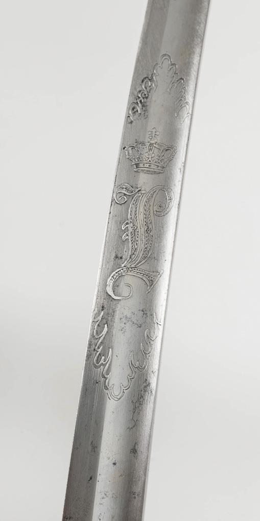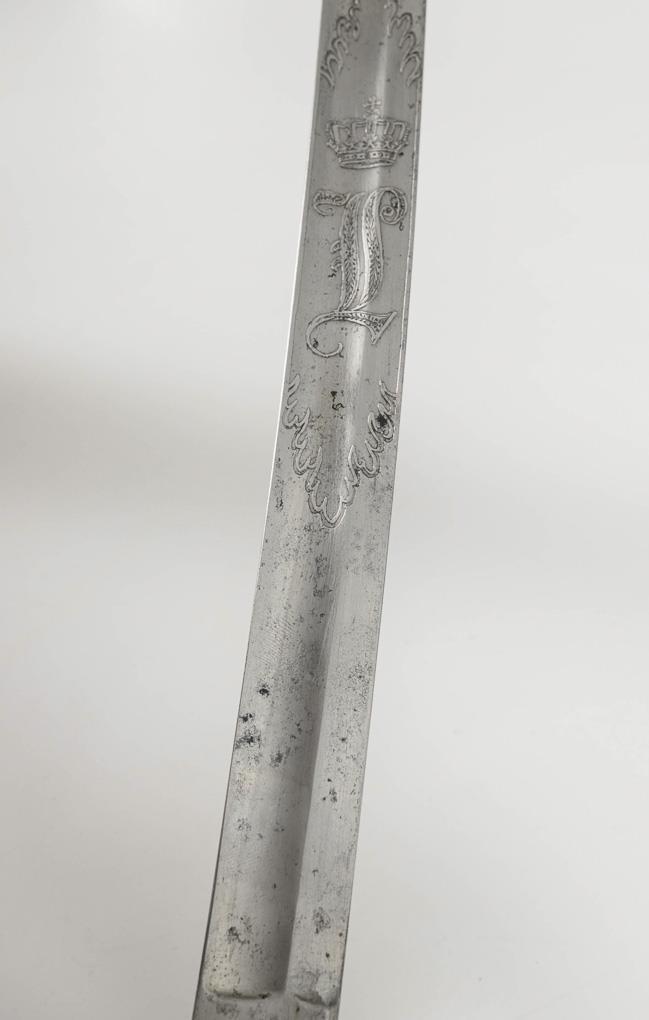 Light sabre with a curved, single-edged blade with a point in the midline. The monogram "L" with crown etched on both sides of the blade. Brass hilt, ribbed grip with chequering, somewhat damaged. Black metal scabbard with a ring.