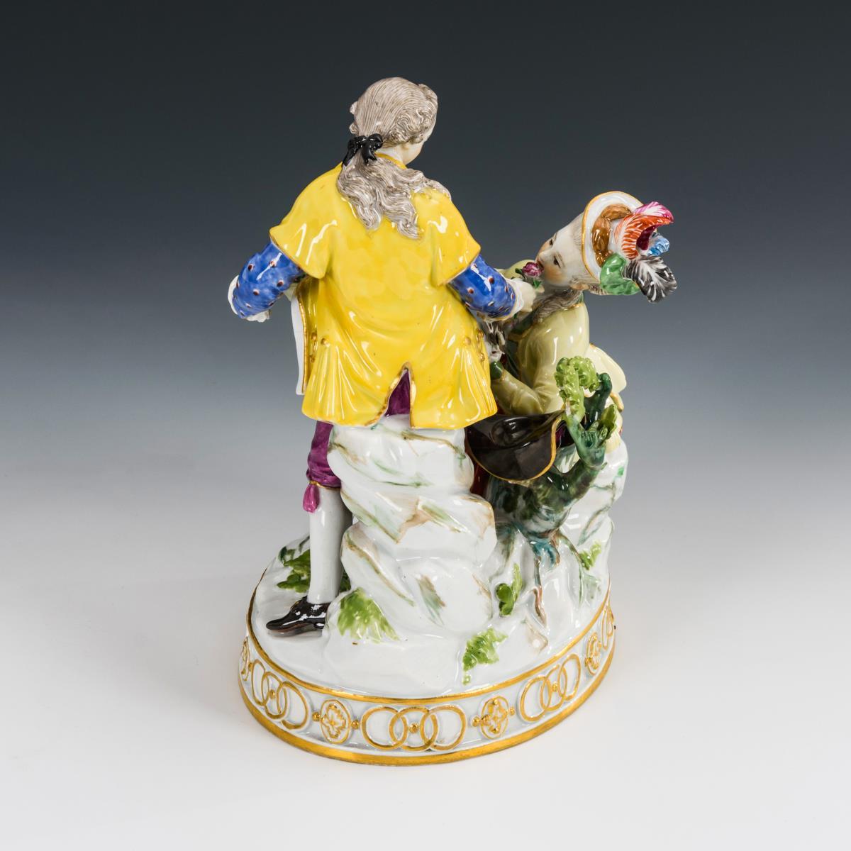 Sitzende Gärtnerin mit Vogelbauer, zu ihrer Linken ein Gärtner mit Blumenkorb stehend. Rechter Fuß der Dame restauriert.