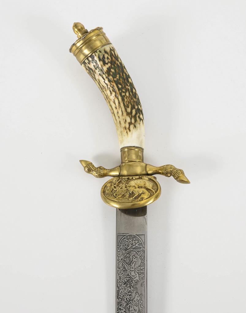 Single-edged, straight blade with etched hunting scene and motto "God with us". Guard plate with animal relief. Black leather scabbard with acorn pommel and bas-relief on the tip.