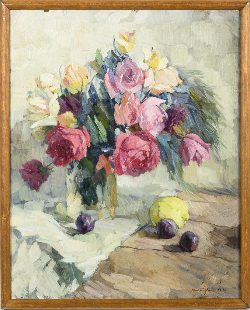 White, yellow and pink roses in water glass next to plums and apple. Minimal traces of age.