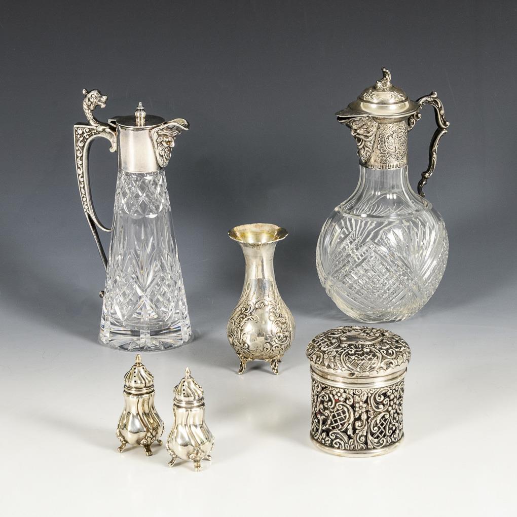 2 small glass decanters, 1x with silver mount (h 22 cm), 1x with metal mount (h 20.5 cm). / English silver box in rich relief with glass insert. The lid engraved with the name "Edith" (h 8 cm). / Small silver vase with rocaille relief (H 11.5 cm). / 2 gadrooned salt shakers (H 7.5 cm each). Some dents, glass without defects.