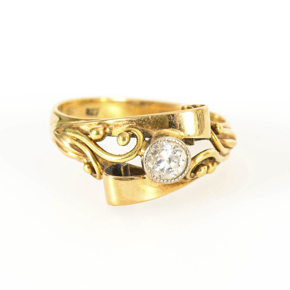 Bezel-set brilliant-cut diamond on elaborately decorated ring center between middle rail.
