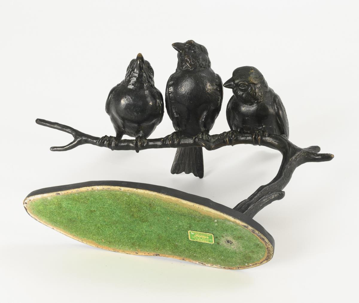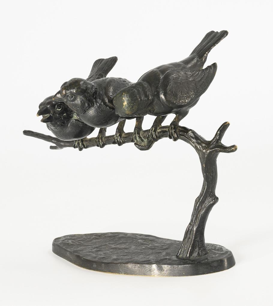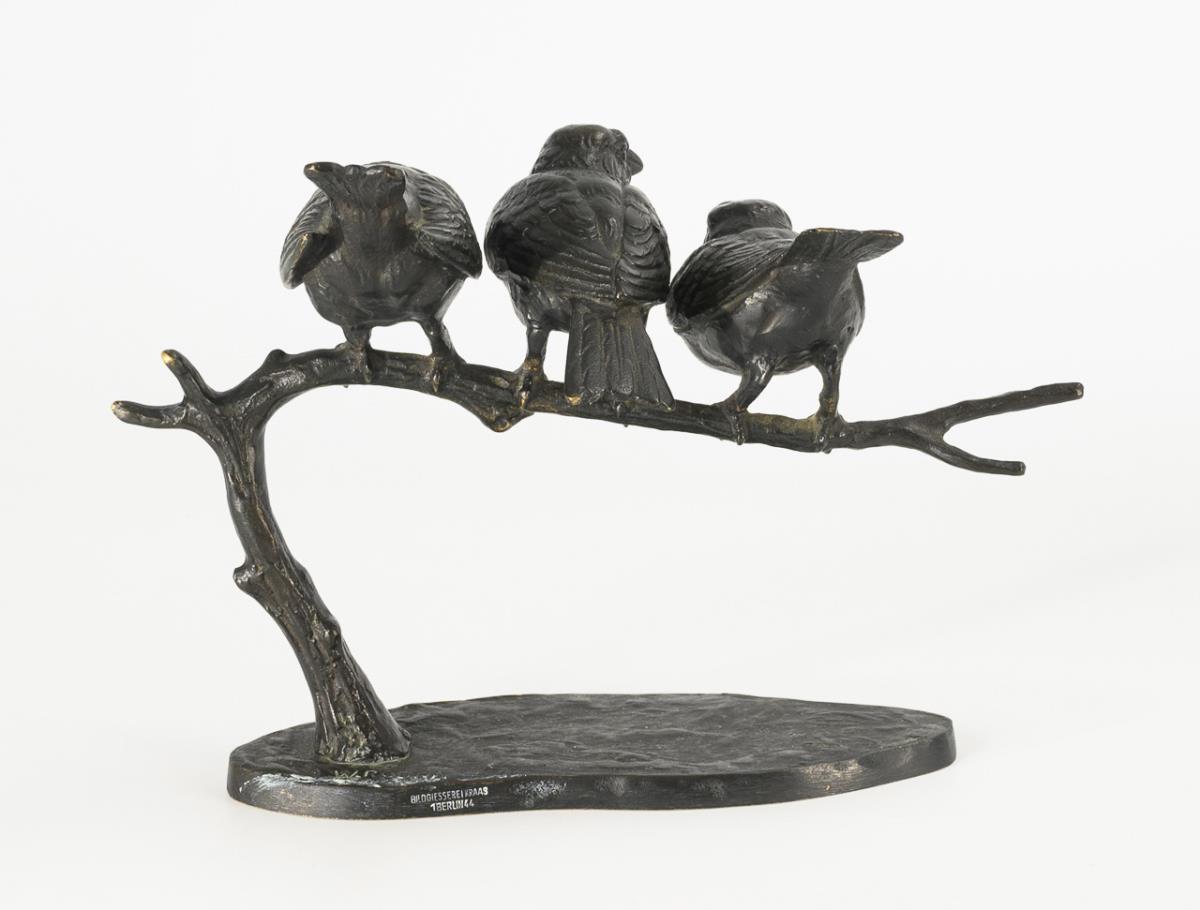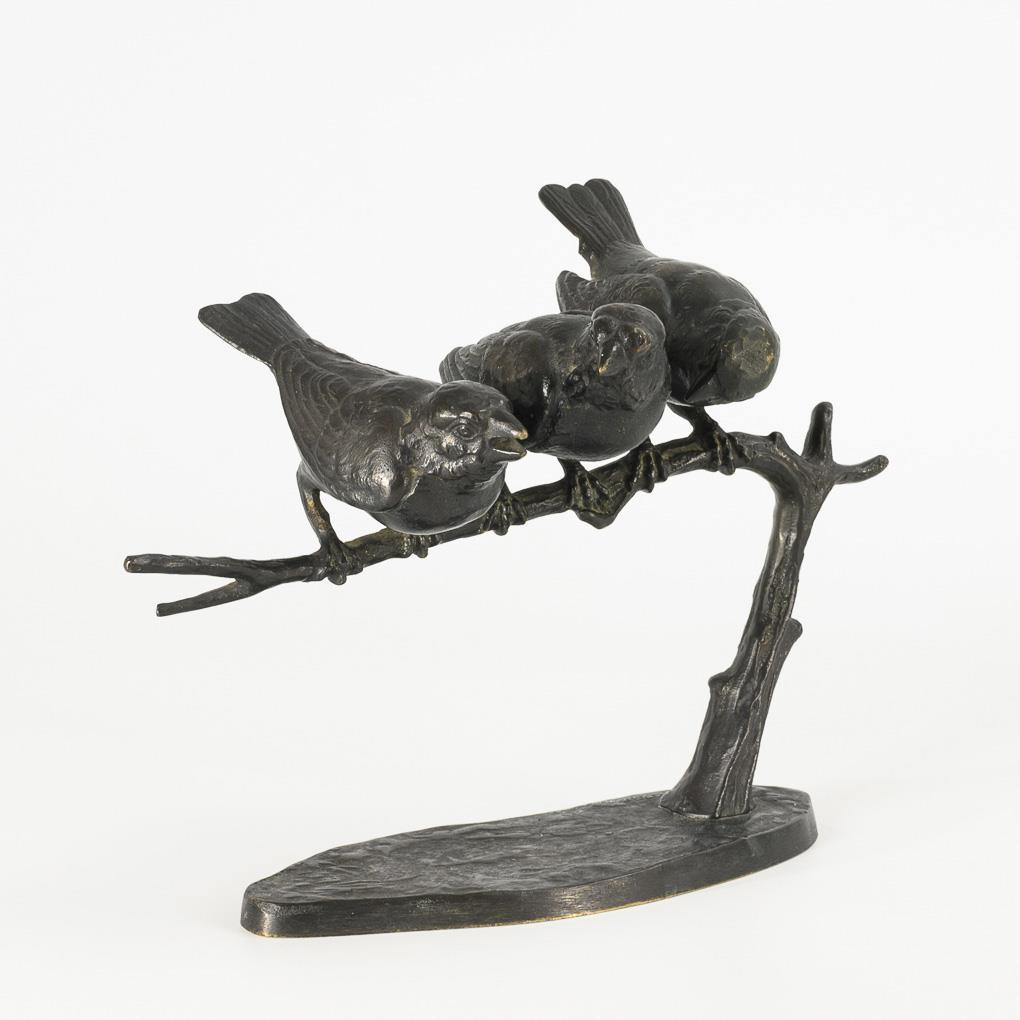 Birds conversing in various gestures on a long branch. 1 leg broken, 2 pressure marks, patina minimally rubbed.