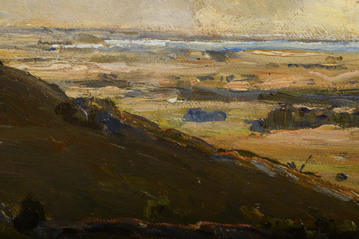 View over a range of hills into the wide sunny plain under a breaking cloudy sky. Slight traces of age.