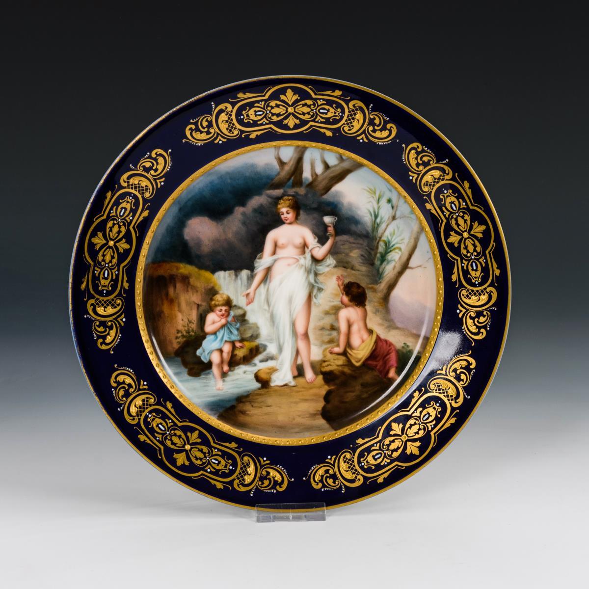 Teller mit Goldrelief- und Juwelenmalerei auf der kobaltblauen Fahne. Im Spiegel die Darstellung einer an einer Quelle stehenden Nymphe mit Pokal sowie zwei Amoretten, unterseitig bezeichnet "Quellennymphe". Goldrand berieben.