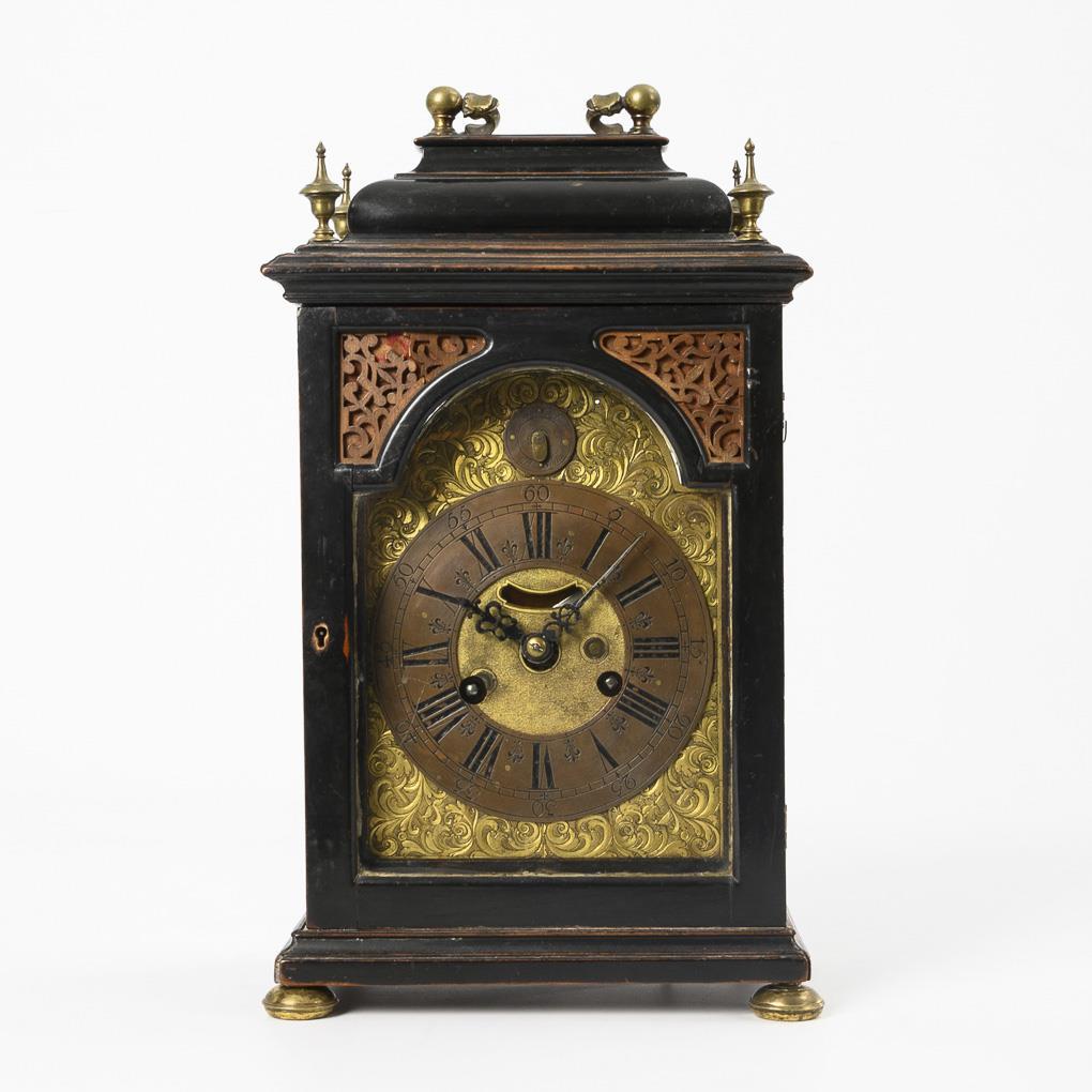 Architectural case, glazed on 4 sides, hipped roof with turret decoration and carrying handle, round arch front with openwork wooden spandrels, inside a brass plate with round arch field and floral engravings, chapter ring with Roman hours and Arabic minutes, minute ring and iron hands. In the center a pendulum view, in the arched field an auxiliary dial for activating the strike. Signs of age and wear, with defects.