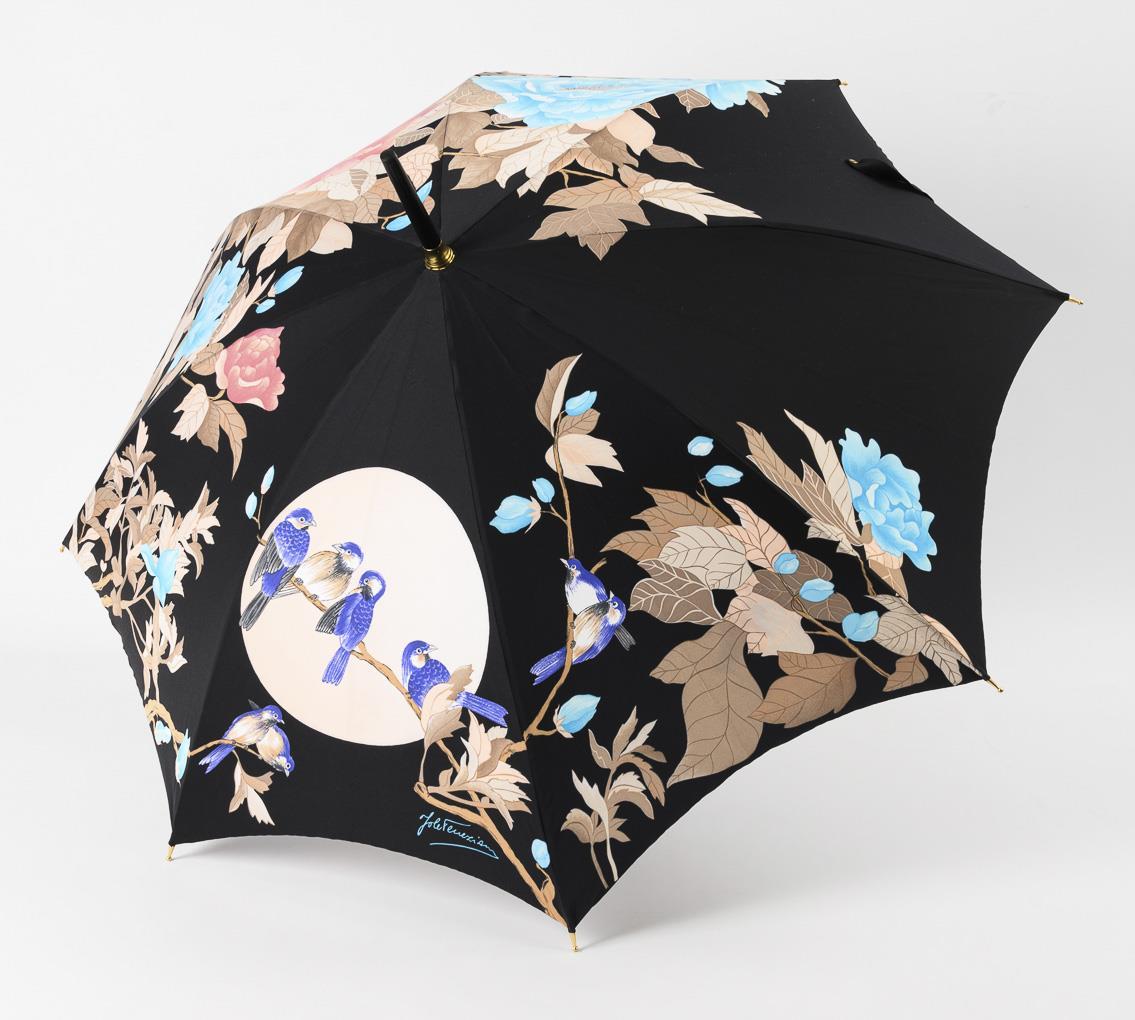 Matching umbrella with round hook handle and square scarf. Each with a colorful print of large peonies and birds on a black background.