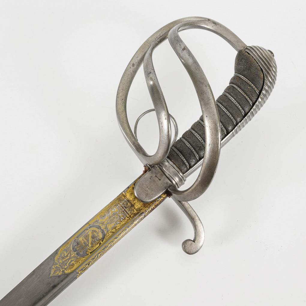Slightly curved, single-edged blade with reinforced bolster and ricasso. Short, stamped and gilded pattern on the scabbard with the Saxon coat of arms and "Eisenhauer, Damascus steel". Three-pronged iron basket with thumb ring. Ribbed grip with chequering and wire winding. Bright metal scabbard with two rings. Small screw at the scabbard mouth missing, small defect at the checkering, scabbard dented at the point.