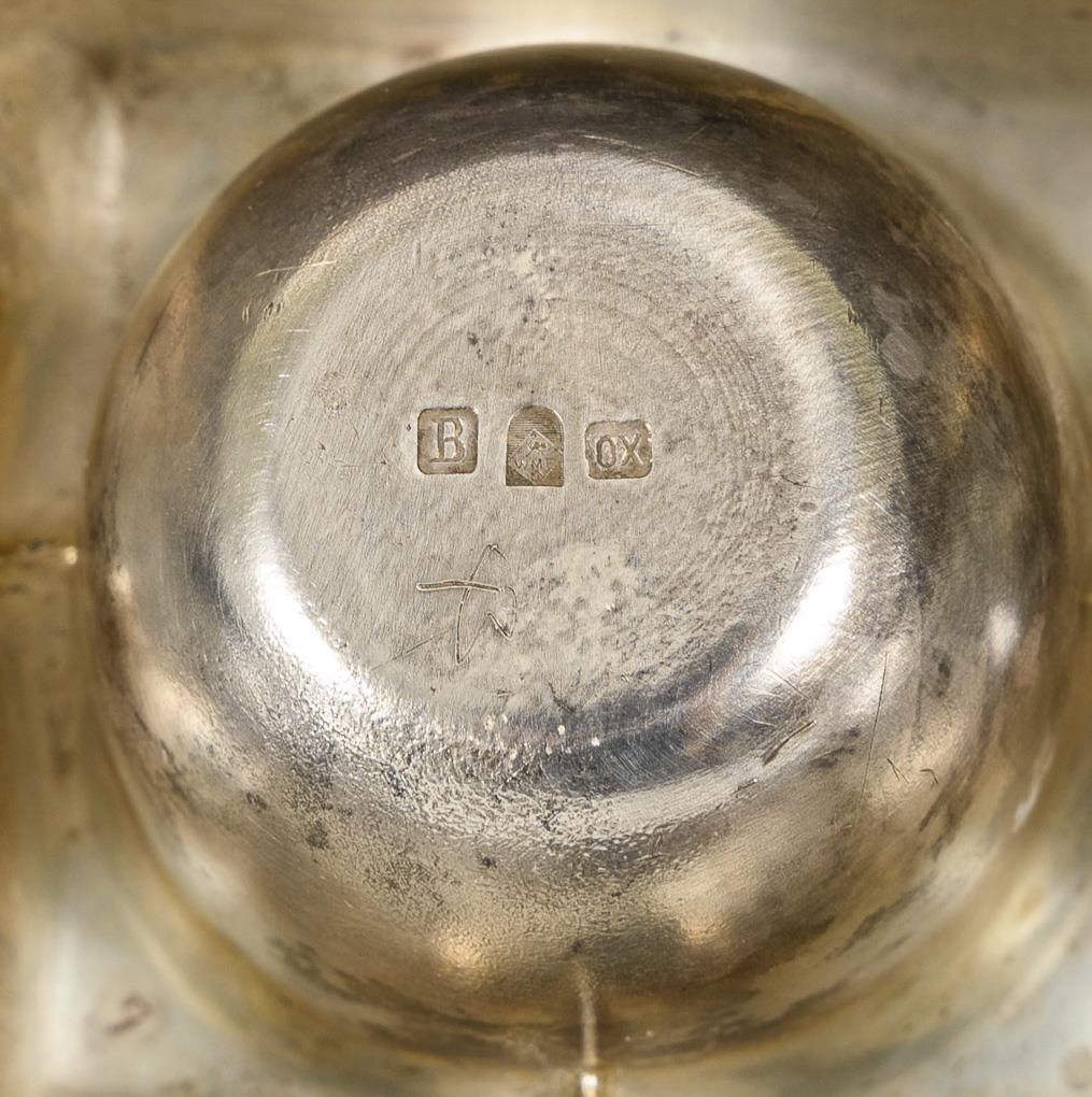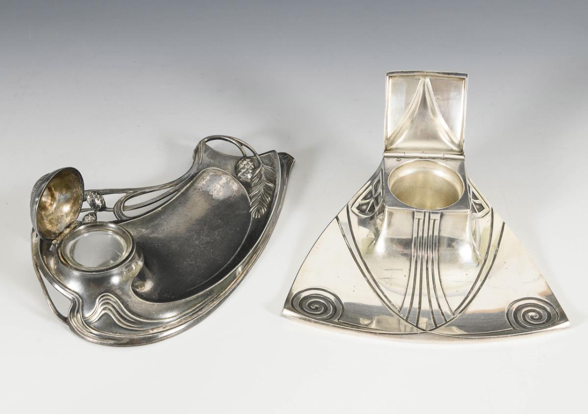 Elegant pair of candlesticks with horns of plenty on a rectangular base and florally decorated spouts on both sides and a shaft of 3 struts. / Small writing utensils with curved vegetal or more strictly geometric relief; each with hinged lid on the inkwell container. 1 glass insert missing.