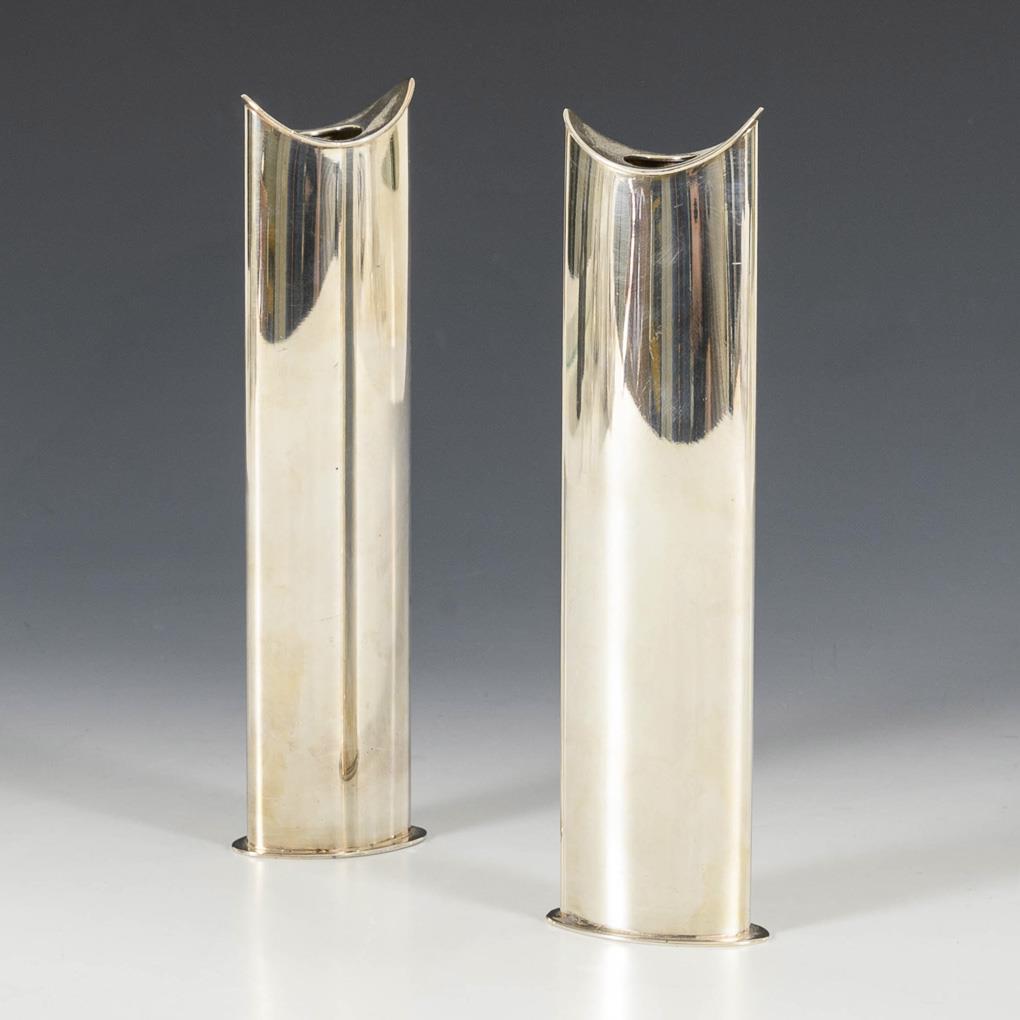 Slim, oval vases and candlesticks. Minimally dented at the base.