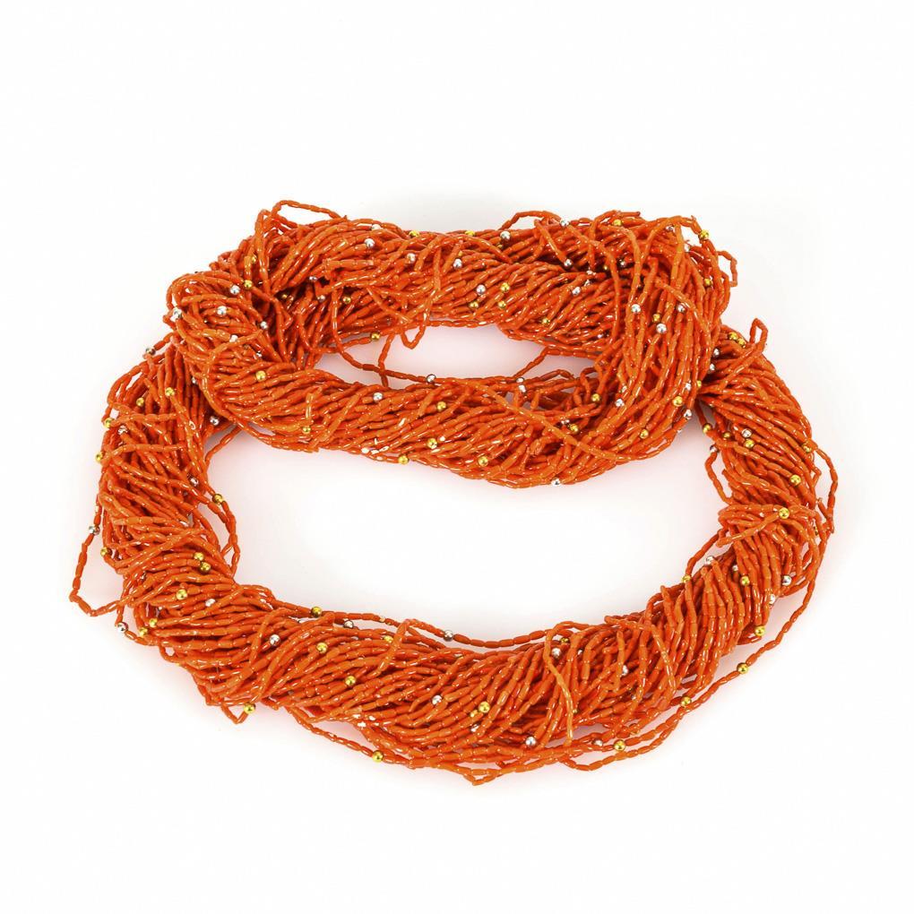 Elaborately crafted, continuous cord chains with small coral rods. In between yellow and white gold beads.