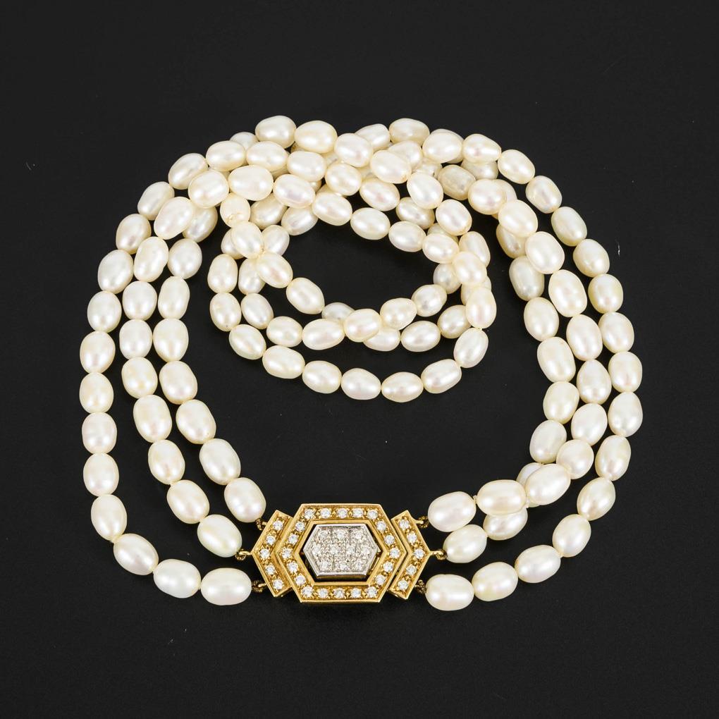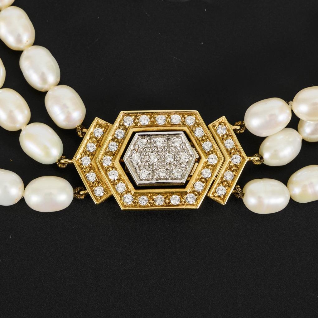 String chains with ovoid cultured pearls on a 2-tone decorative clasp with 40 embedded diamonds. Box lock with safety catch.