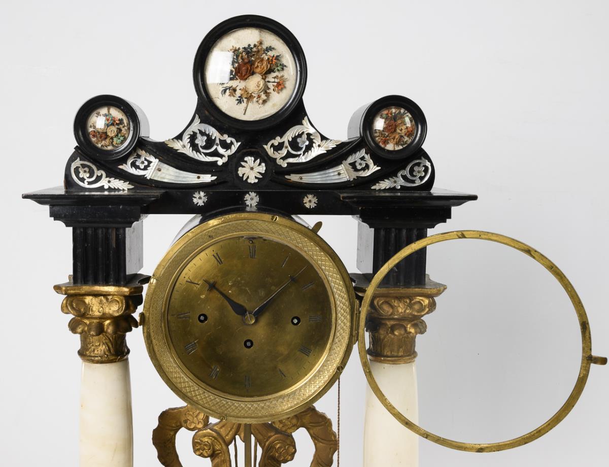 Biedermeier column clock with profiled base and 2 alabaster columns, lyre carving and high entablature with 3 integrated fabric flower pictures. Signs of age and wear, some defects and missing parts.