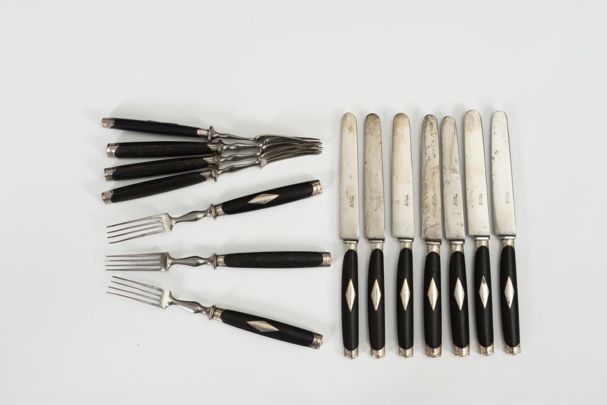 7 Messer und 7 Gabel je mit Rauten-Einlagen. Teils haarrissig, je stärkere Gebrauchsspuren.