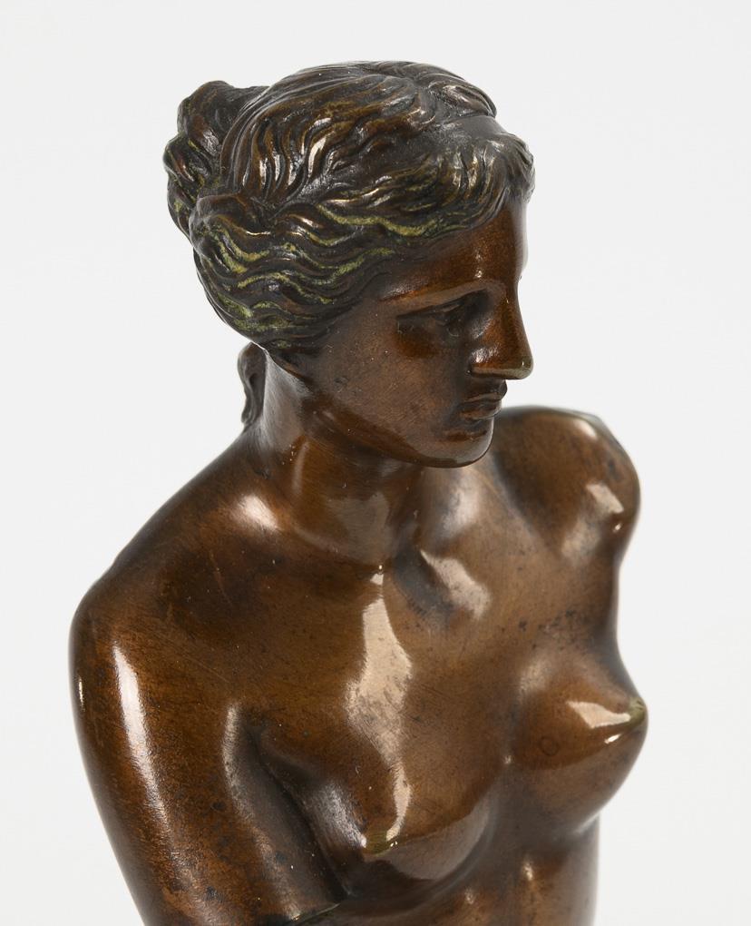 Designed after the probably most famous figure of antiquity, the goddess of love, which is now in the Louvre. Patina somewhat rubbed.