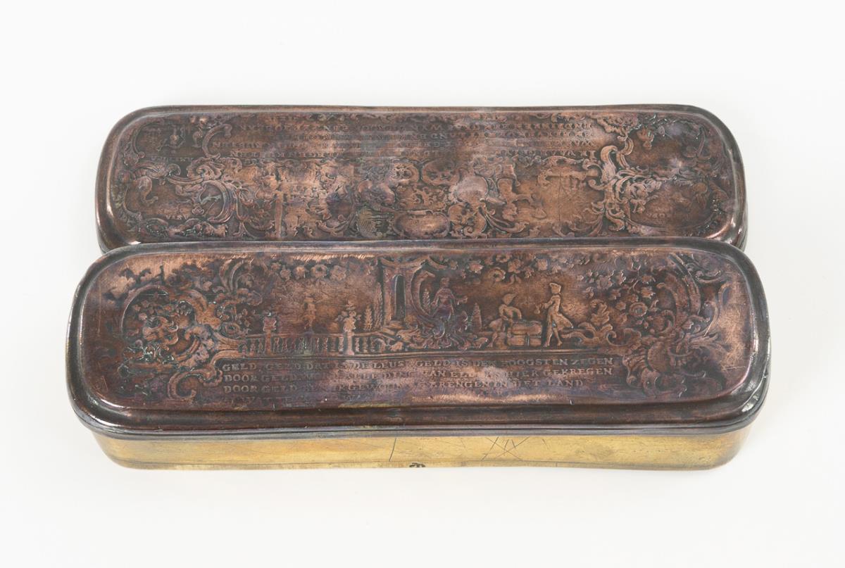 Oblong box made for the Dutch market with scenes in rococo relief frames: On the hinged lid, the Dutch coat of arms, flanked by Mercury and a round table; below, a Dutch saying. On the base Mercury and merchants with bales of goods in a park-like landscape above a Dutch motto . Drill hole to the back of the wall, missing parts of the wall covered by the base rim, otherwise a few signs of age/use.