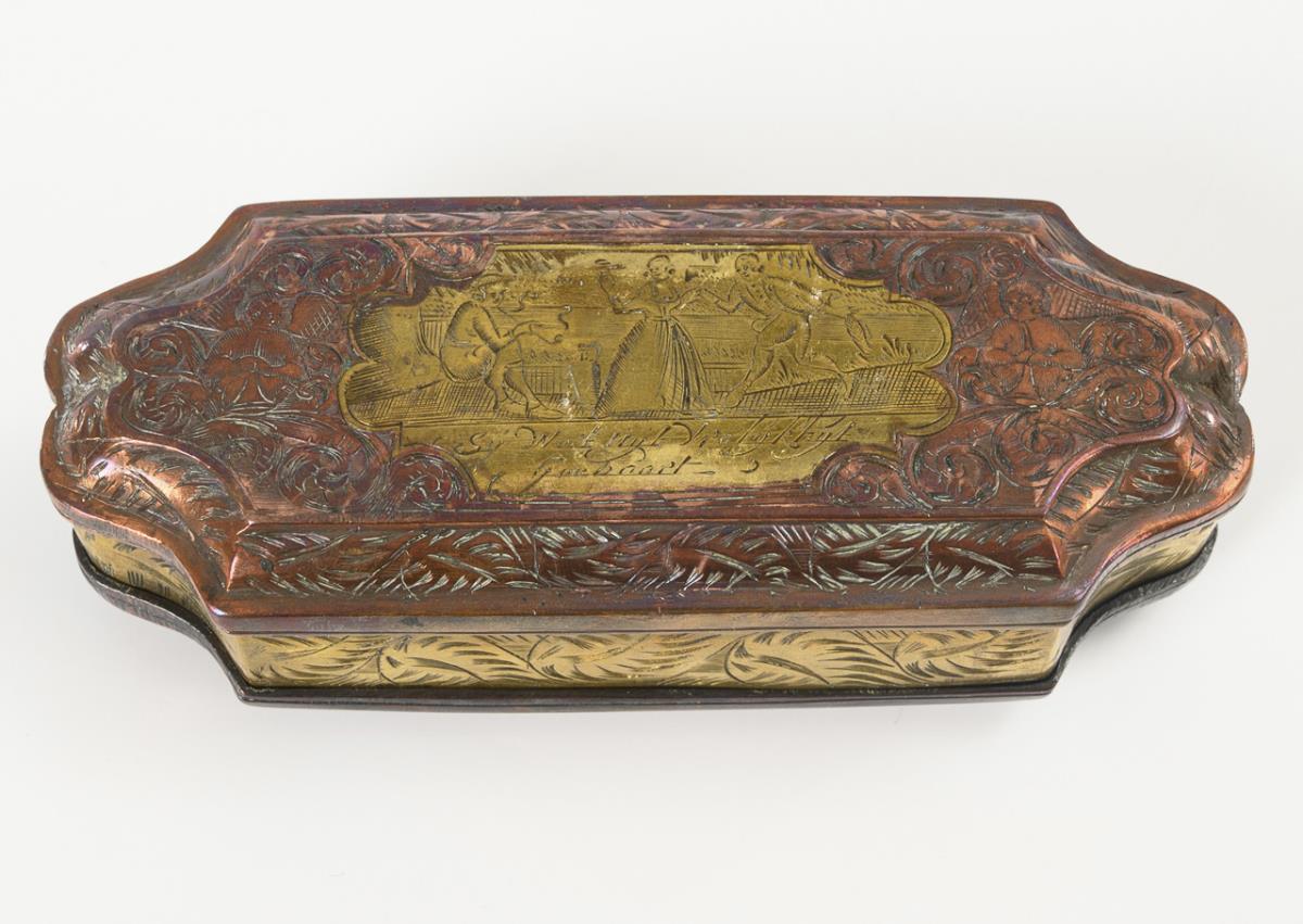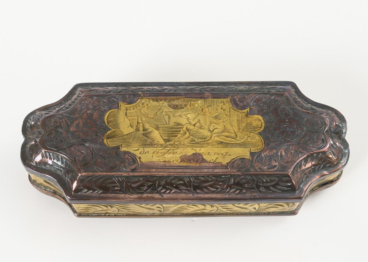 Oblong box with matching curved narrow sides. The base and hinged lid with finely engraved couple scenes with mottoes in ornamental engraved frames with accompanying persons. A circumferential engraved ornament on the wall.