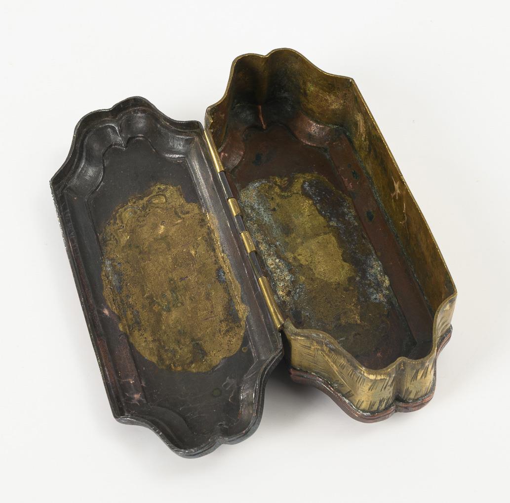 Bottom and lid engraved copper, partly gilded, brass wall engraved. 4 x 13 x 5.5 cm.
