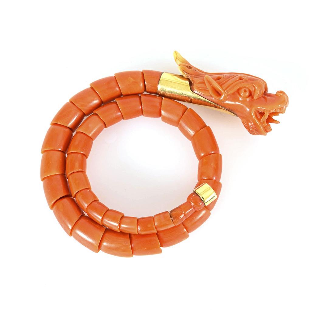 Open hoop with cut dragon head and strung coral links with GG mounts.