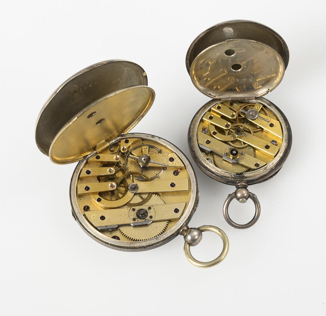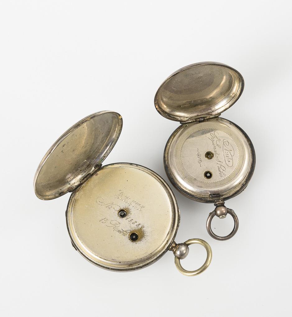 Bridge movements with cylinder and lever escapement, each with key winding. Movements do not run. White enamel dials with Roman numerals, 1x with blue Arabic minutes, 1x with small second.