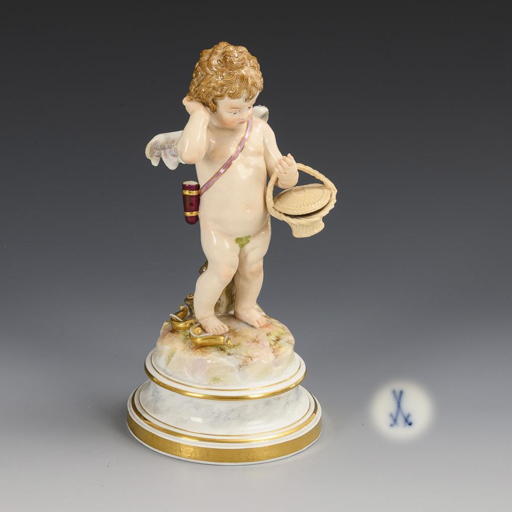 A cupid boy with basket standing on a round base, scratching his ear in disappointment .