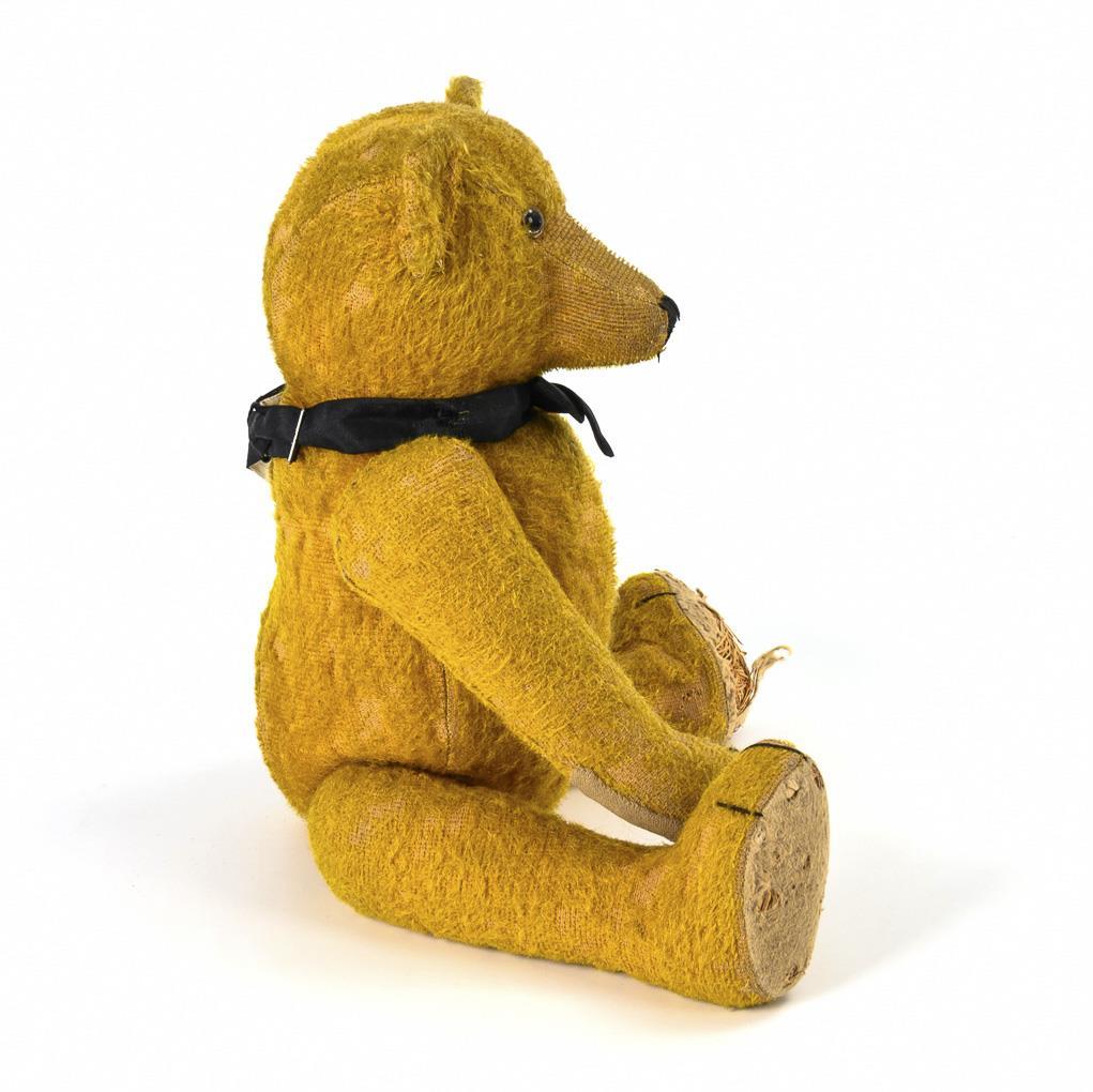Yellow mohair teddy bear with swivel head, glass eyes, disc joints and black neck bow. Fur bald, voice muted, front paws overstitched, felt paws with holes.