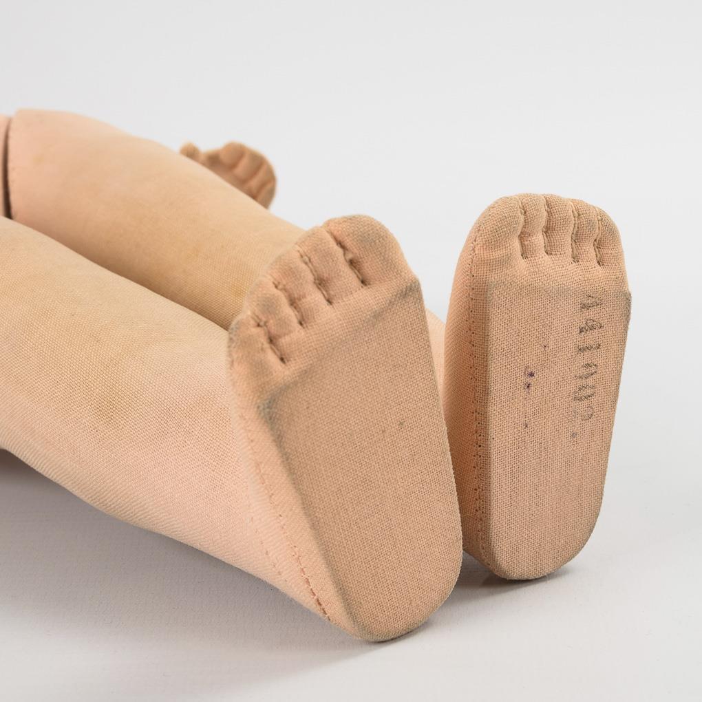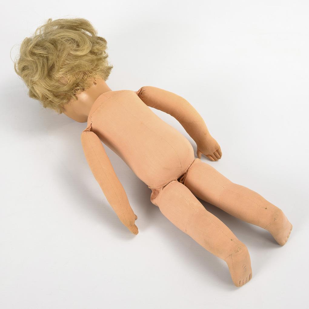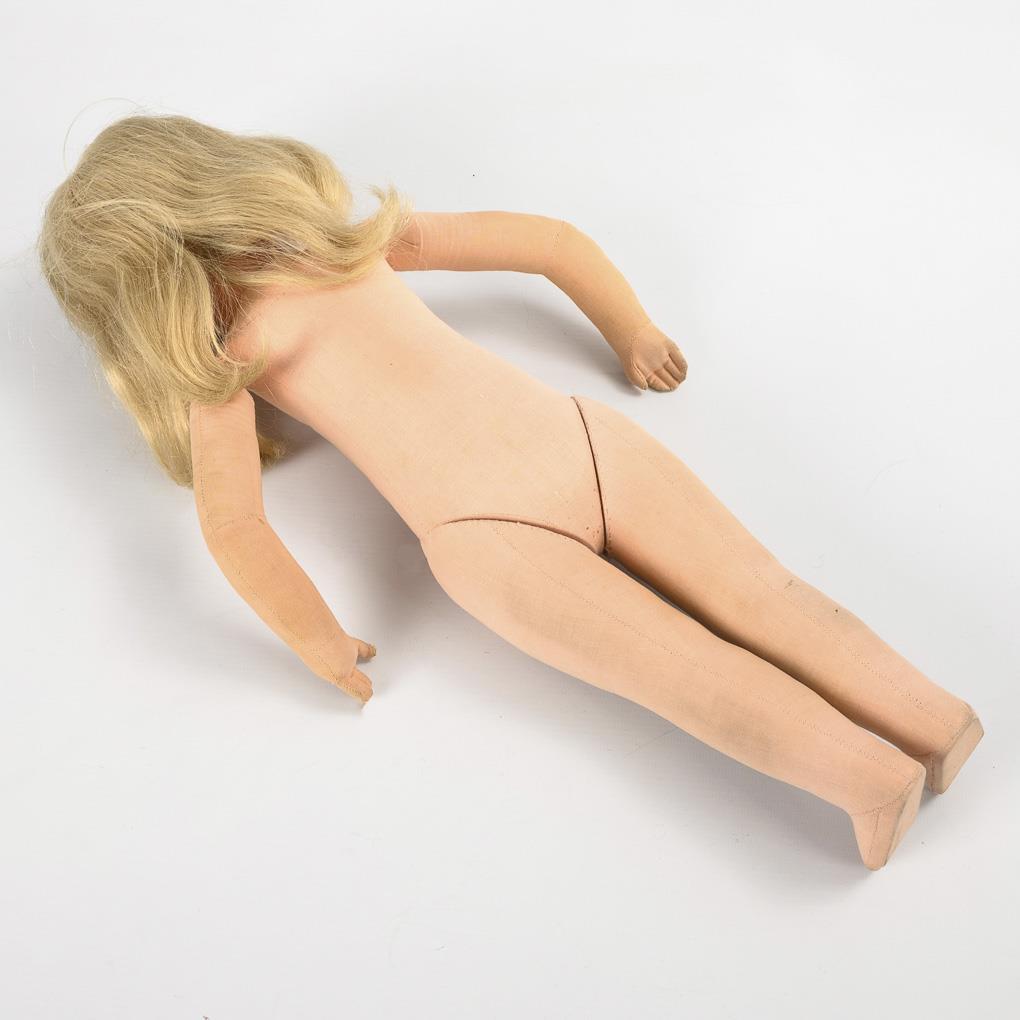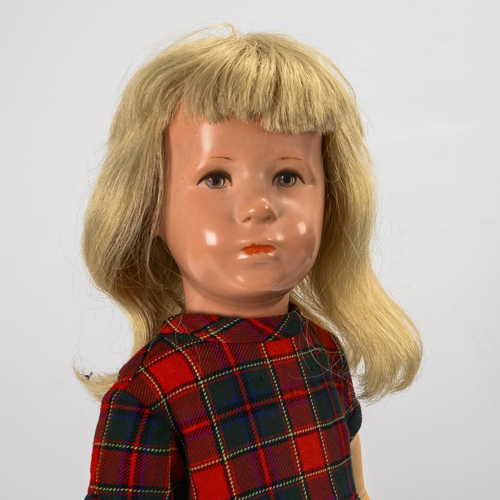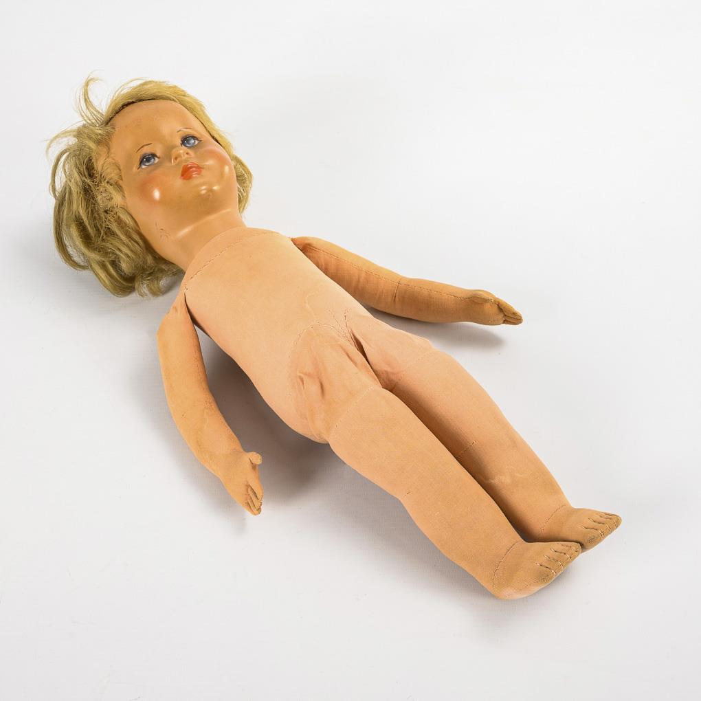 Blonde doll girl type VII with tortulon head (not primed skin-colored), real hair wig, slim fabric body, checkered dress and white leather shoes, l 52 cm. / Blonde "Hampelschatz" (probably type XII bra) with plastic head, human hair wig and Hampelchen body (without button and ribbon in the back). Flowered dress, dark blue cardigan, L 45 cm. Both stained on the body, 1x face painting rubbed.